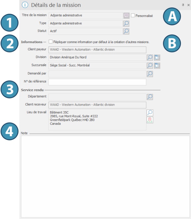 This pane displays the detailed information for each mission, such as the client, the workplace or the reference number. Moreover, it determines the type of job that will be that will be sought for this assignment.
