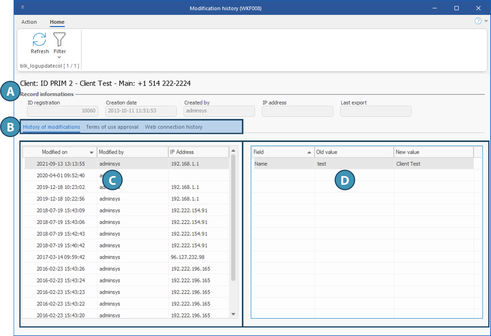(Modification history). To investigate a specific element, select it before you click on the button. If no item is selected, the window will display all the changes made in the concerned file. In the example below, the window was called from a client file.