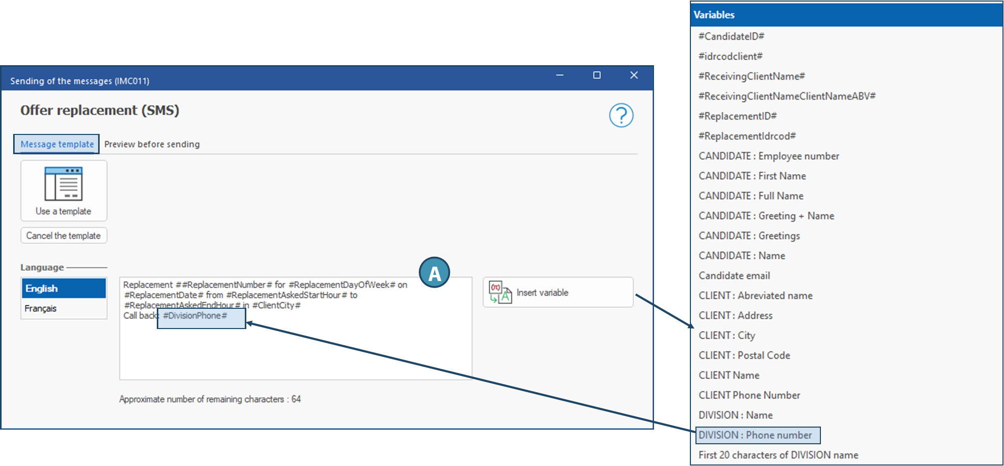 List of contacts (A): List of all contacts to who the message can be sent depending on the context. The SMS will be sent only to the contact where the check box have been ticked.
