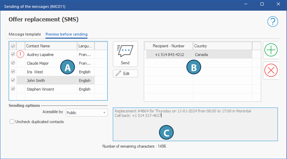 Message area (C) : Provides a preview of the message for the selected contact. To modify it only for this contact, click on the Edit button. The field will not be grayed out anymore and you will be able to modify the message for this contact.