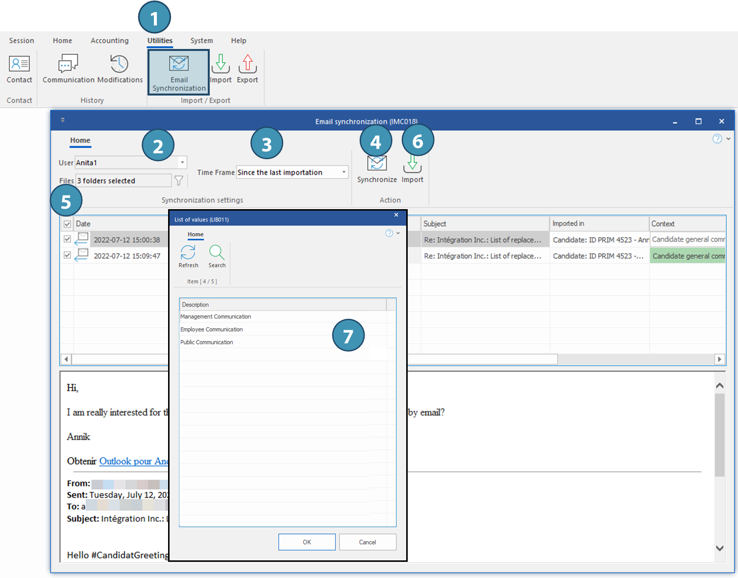 1. To synchronize your emails, go to the "Utilities" ribbon and the "Import / Export" section, then click on the "Email Synchronization" button