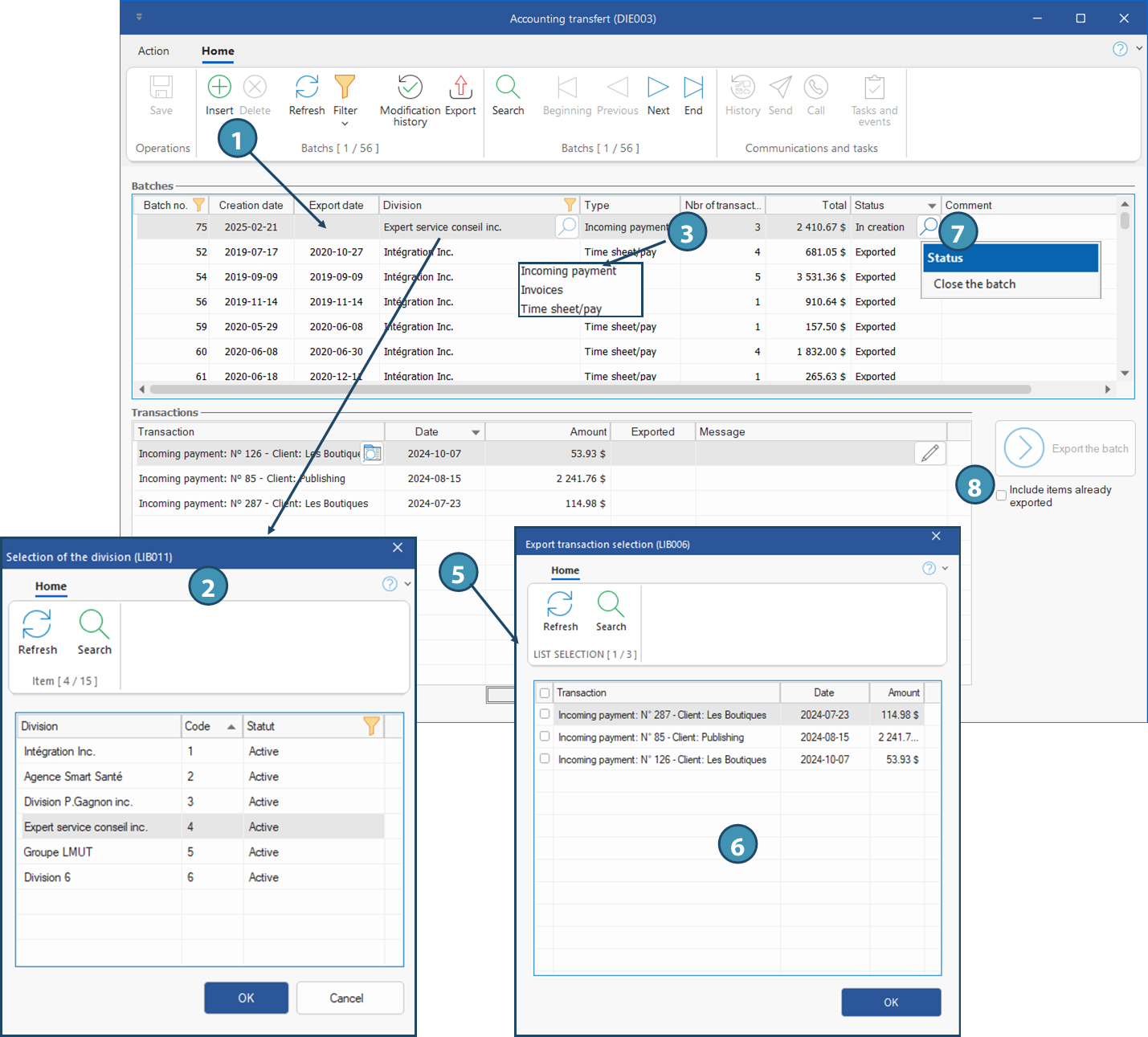 It is recommended to export financial data frequently to avoid long lists of data to check before closing the batch.