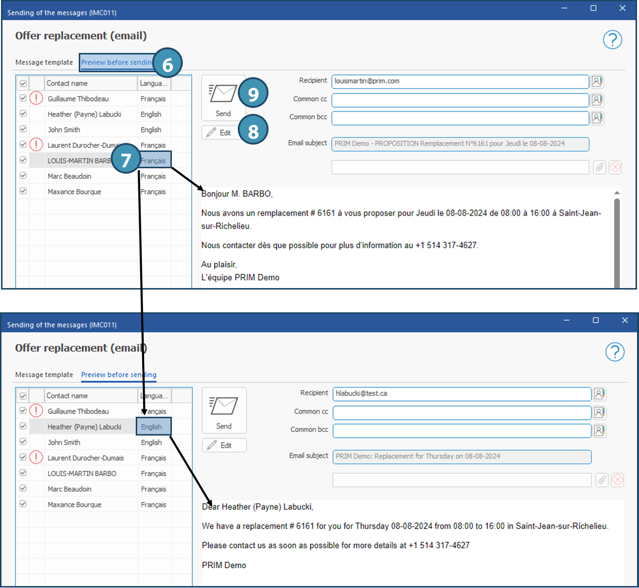 •A report generated by PRIM: allows attachment of a report generated by PRIM. Available reports will vary depending on the communication context. The report will be displayed in the language or the message and recipient.