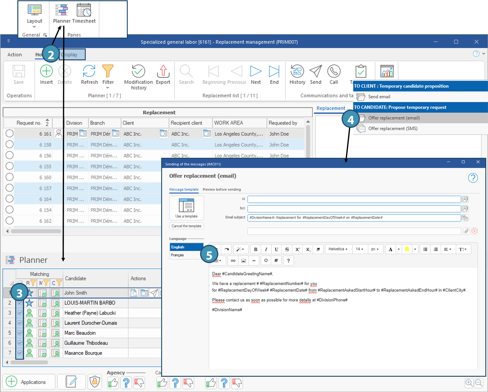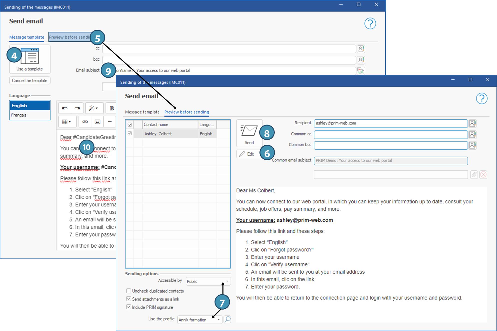 If you insert attachments under the first tab, "Message template", and the message is sent to several contacts, all contact to whom the message is addressed will receive the same attachment, except for a PRIM generated report will be personalized for each recipient. A different document must be added in each language of the template (document in the proper language), including reports generated by PRIM, although the document will be the same in this specific situation.