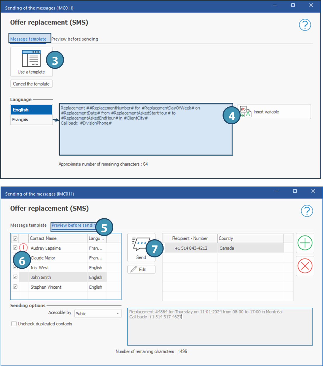Window - Candidate: From the "Shift proposal" pane, you can send an SMS with detailed schedule or proposed shifts. The same templates can be used from the planner in the shift management window, in a shift or in a grouped shifts request.