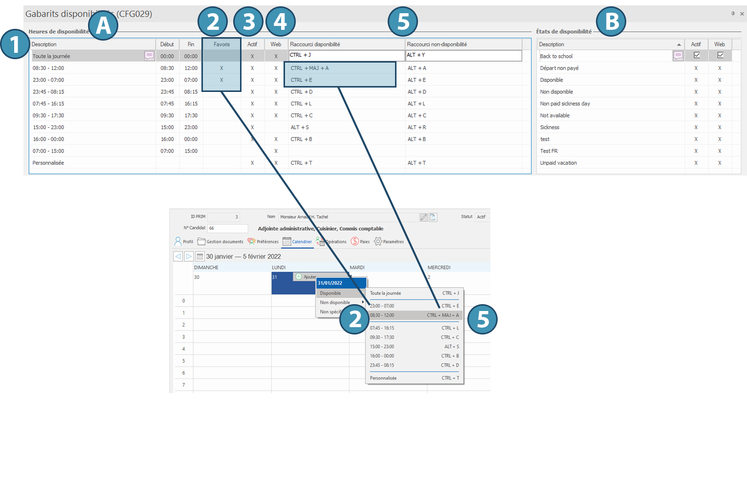 The table "Availability statuses" (B) allows you to manage the wording of the conditions for unavailability, either in PRIM (column "Active") or on the Web platform (column "Web").