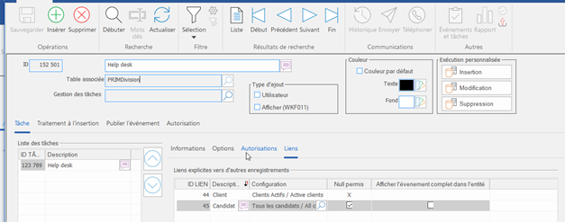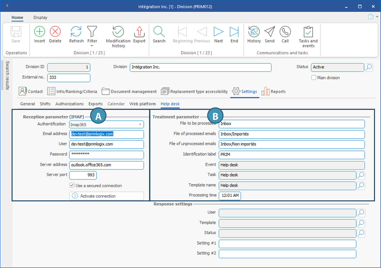 The Help Desk is configured in the Division window (PRIM012), under Settings > Help Desk. This allows each division to have its own Help Desk.