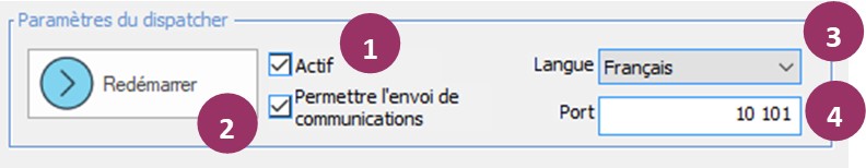 2. Checking this option enables the dispatcher to send communications. For the dispatcher to function correctly, this button must always be checked in the "Production" database, and never in the "Test" database.