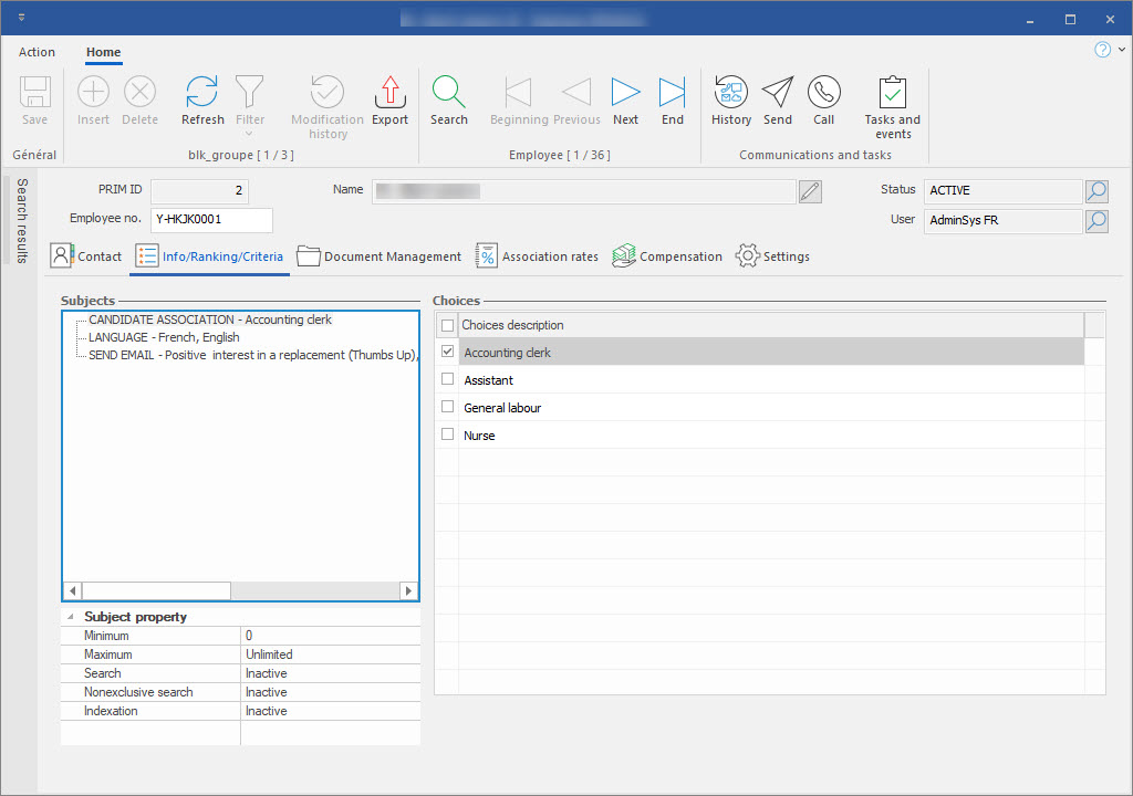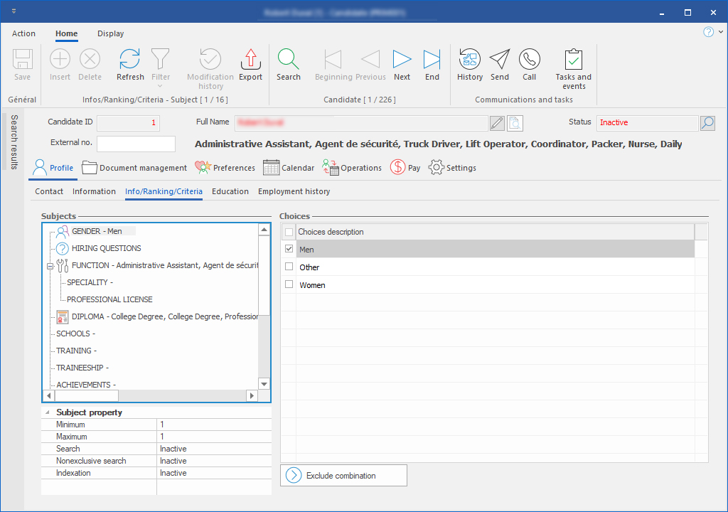 In the candidate's window, you will find the indexing criteria and options to characterize the candidate.