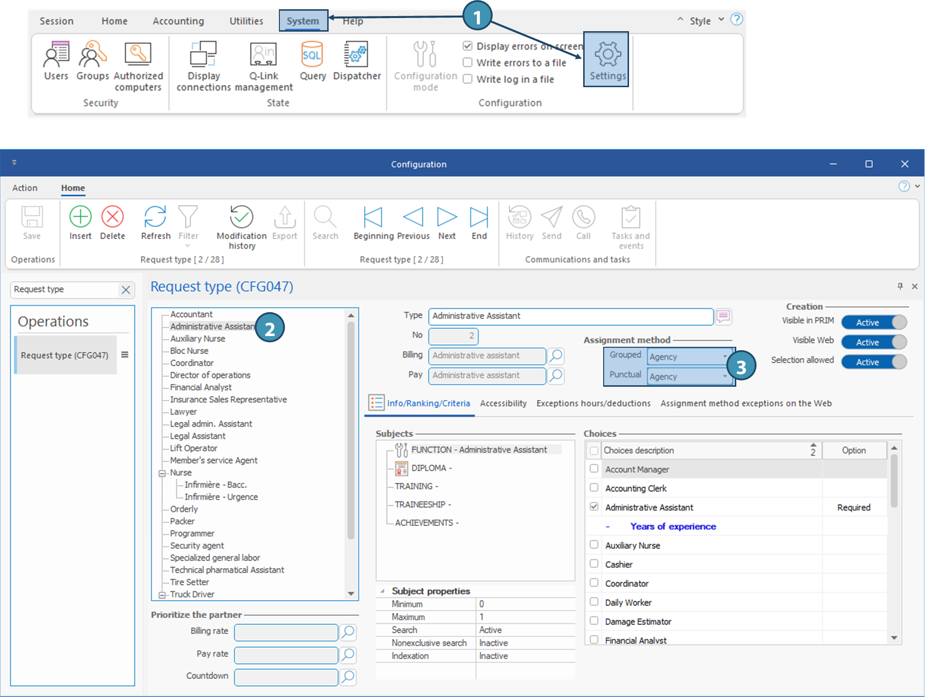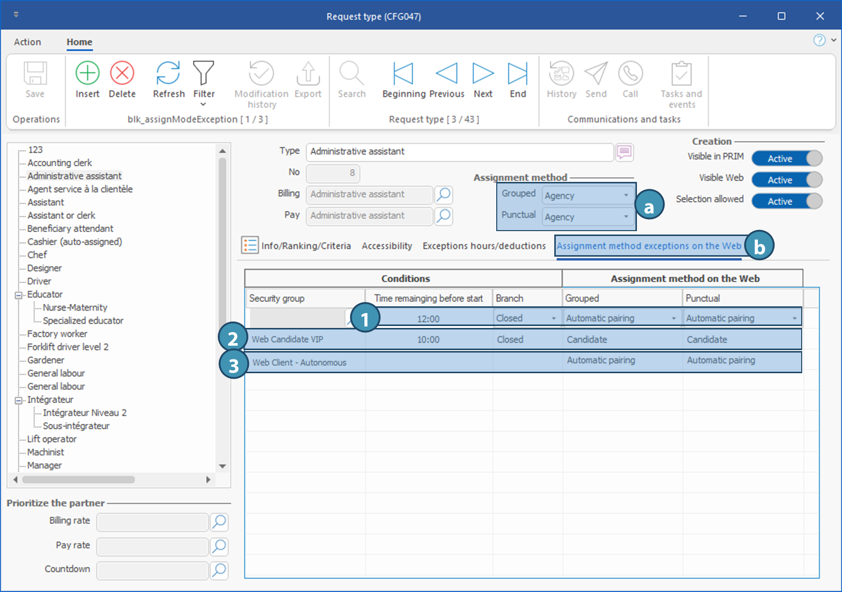 In the examples below, the assignment method for request type Administrative assistant is Agency (a). However, in the tab Assignment method exceptions on the Web (b), 3 exceptions have been created to this type of request. exceptions ont été créées pour ce type de demande :