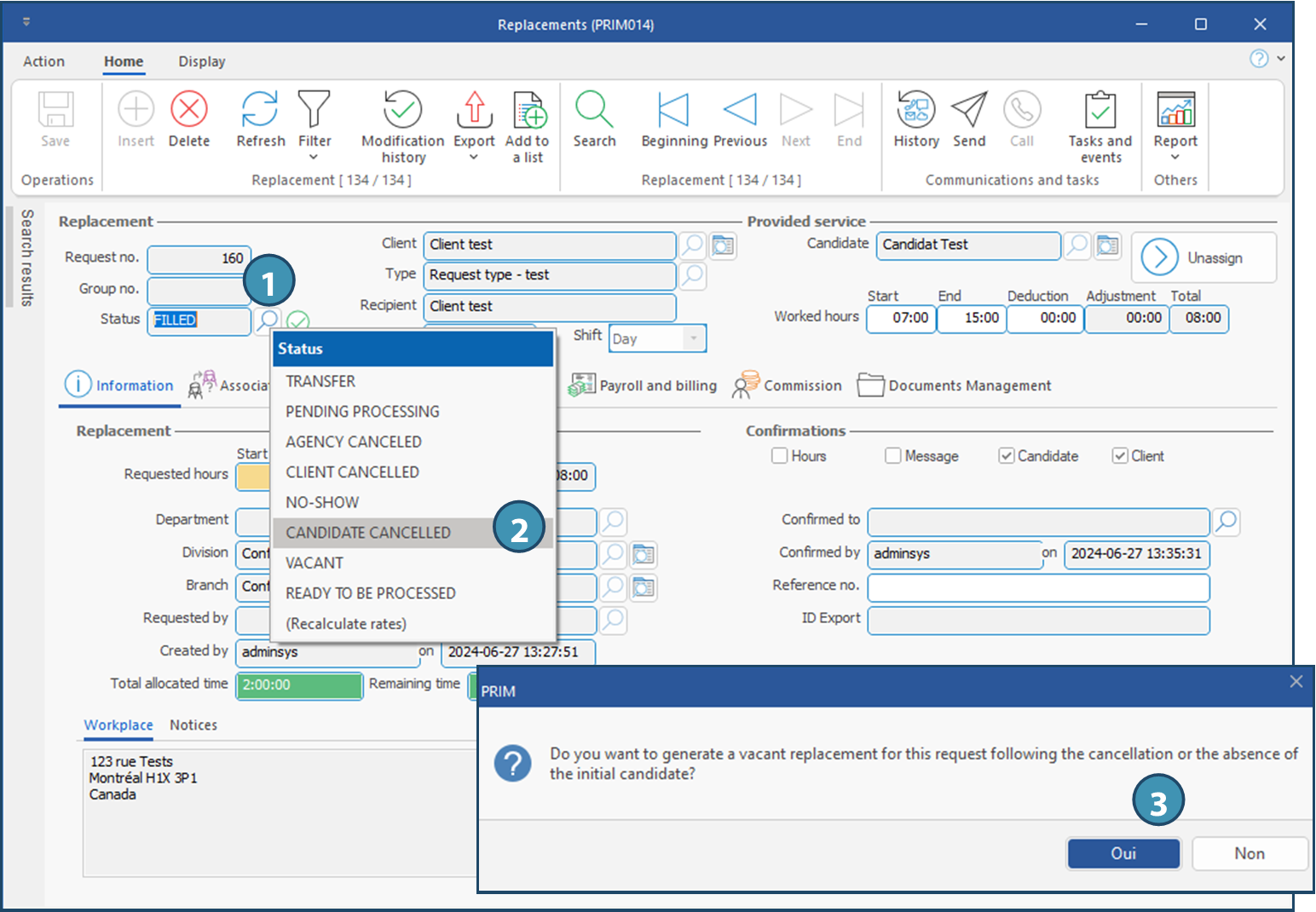Depending on the option selected, a message might be displayed. In the example below, the option "Candidate cancelled" was selected: you will be asked if a copy of the shift should be created to allow assignation of a new candidate, taking into account any action performed in the initial shift. (3)