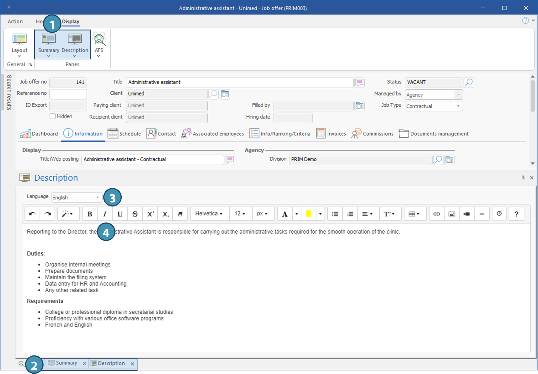 The Description and Summary docking panes allow you to create a description of the job offer that will be displayed on job boards.