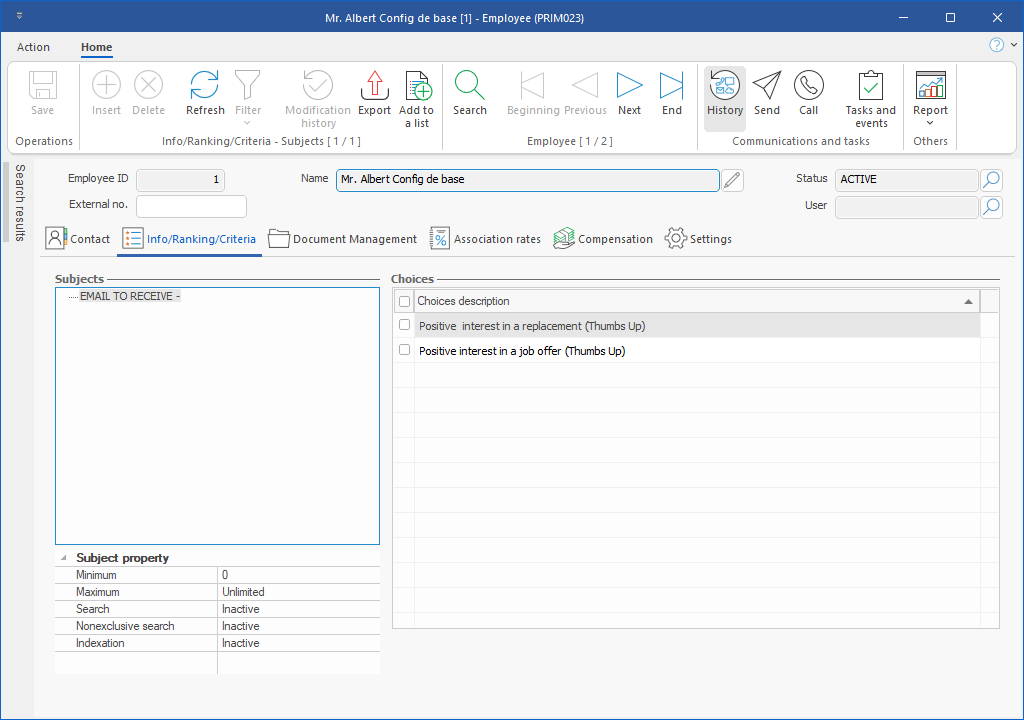 The Info/ranking/criteria may contain any additional information about the employee that you want to set up, such as known languages or else. The basic configuration includes emails to be received regarding candidate's interest in job offers or shifts.For more details on this tab, see the corresponding page in module 1.
