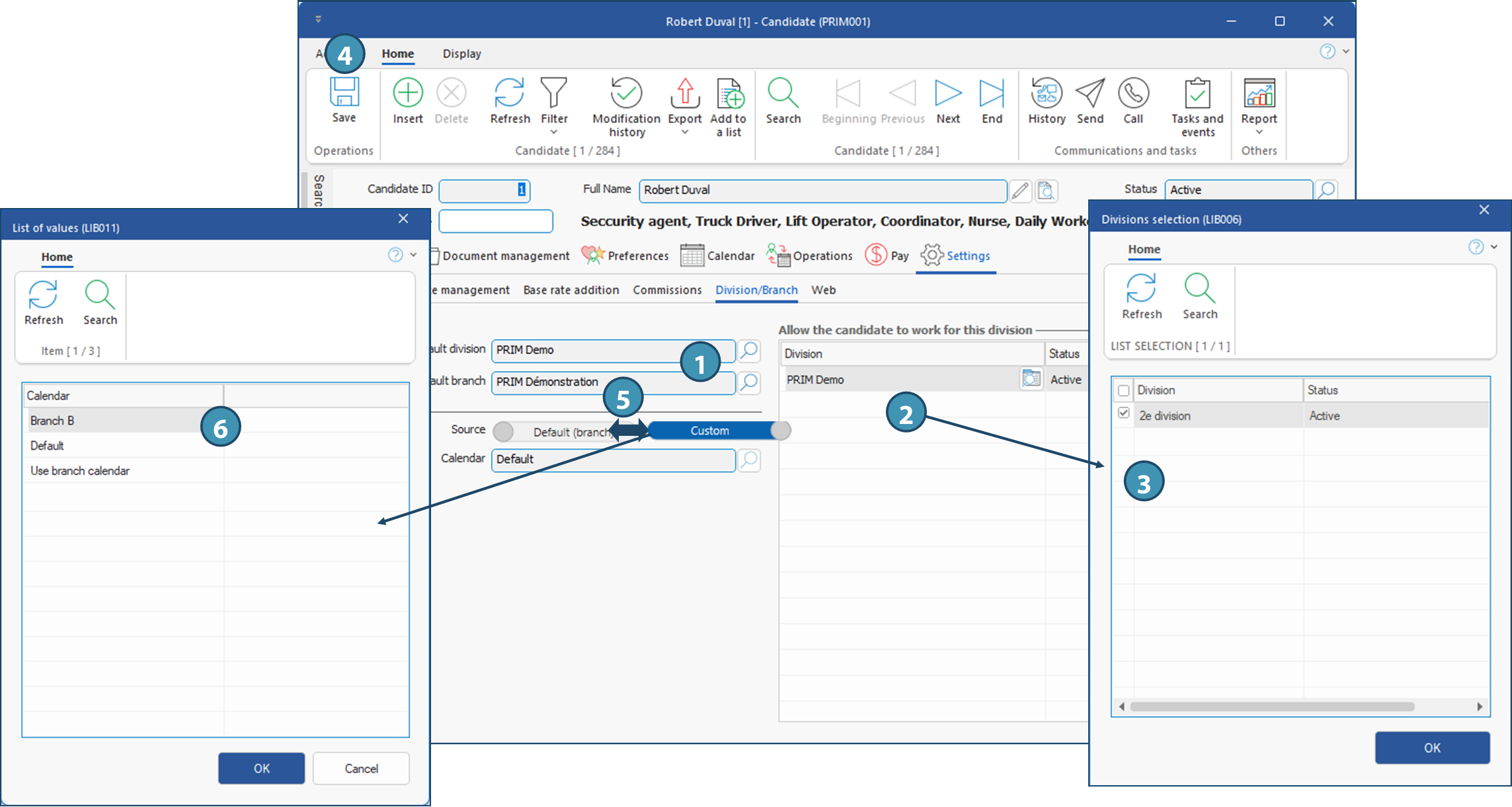 2.In section "Allow the candidate to work for this division", click on an empty line to add a record. 3.In the window that is displayed, tick one or more division and click on OK.
