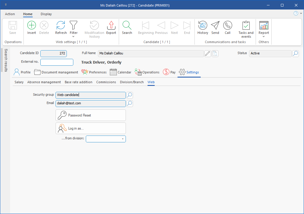 3.Password Reset: When you click on this button, an email is sent to the candidate with a link for password reset. . 4.Log in as: Allows to your agency's employees to connect to the candidate's account on Web portal without the password.