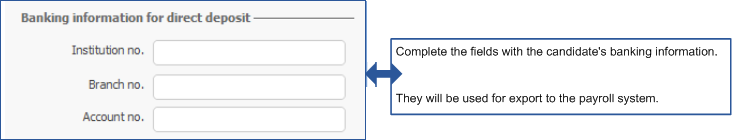 If you have access to this section and to the Salary sub-tab, you can add the candidate's banking information for direct deposit of payroll.