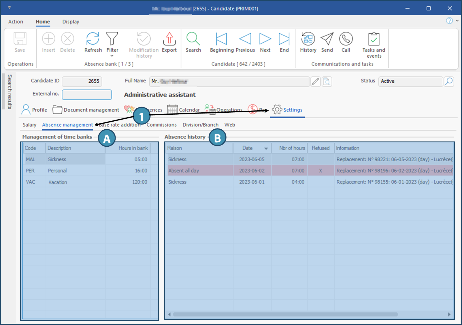 To access it, in the Candidate window, go to Settings tab and Absence management sub-tab (1).