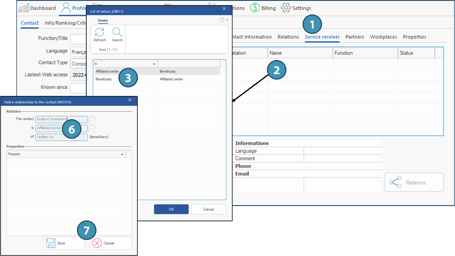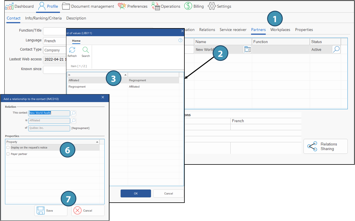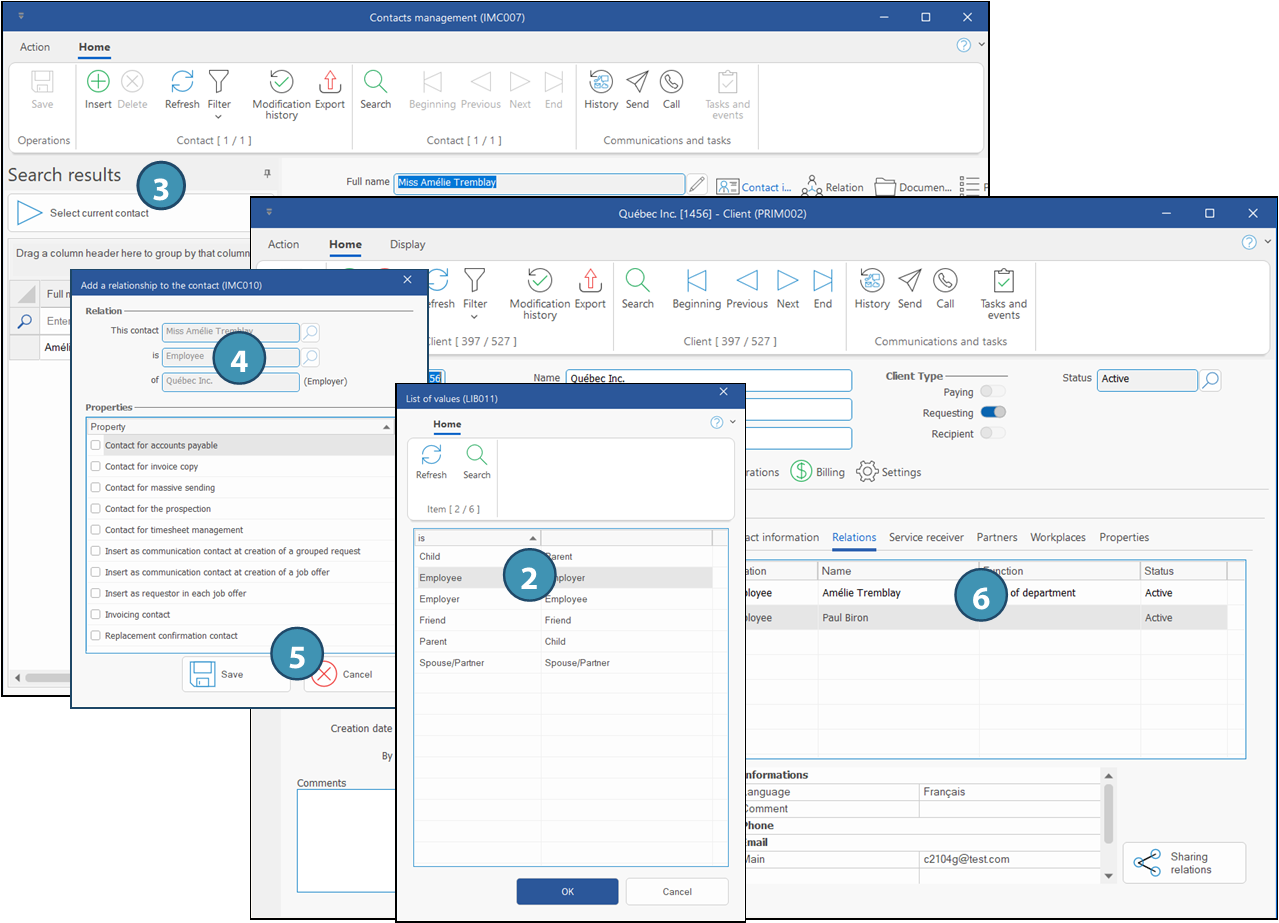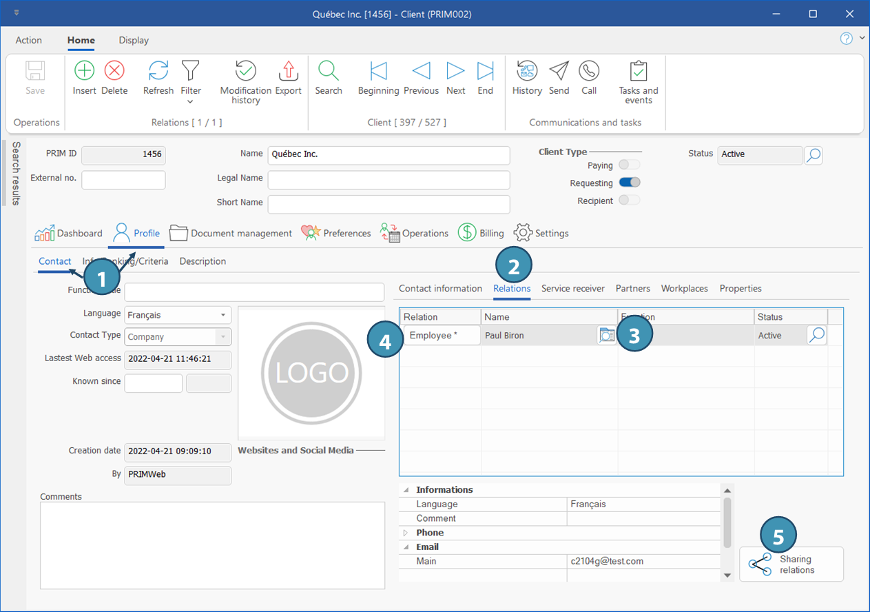 First, it is important to understand that the words "Relation",« Service receiver » and « Partner » all refer to a type of relation. It is possible to share relations between clients, tous des types de relations. Il est ainsi possible de partager les relations d'un client avec un autre client, provided that this other client is also a relation.