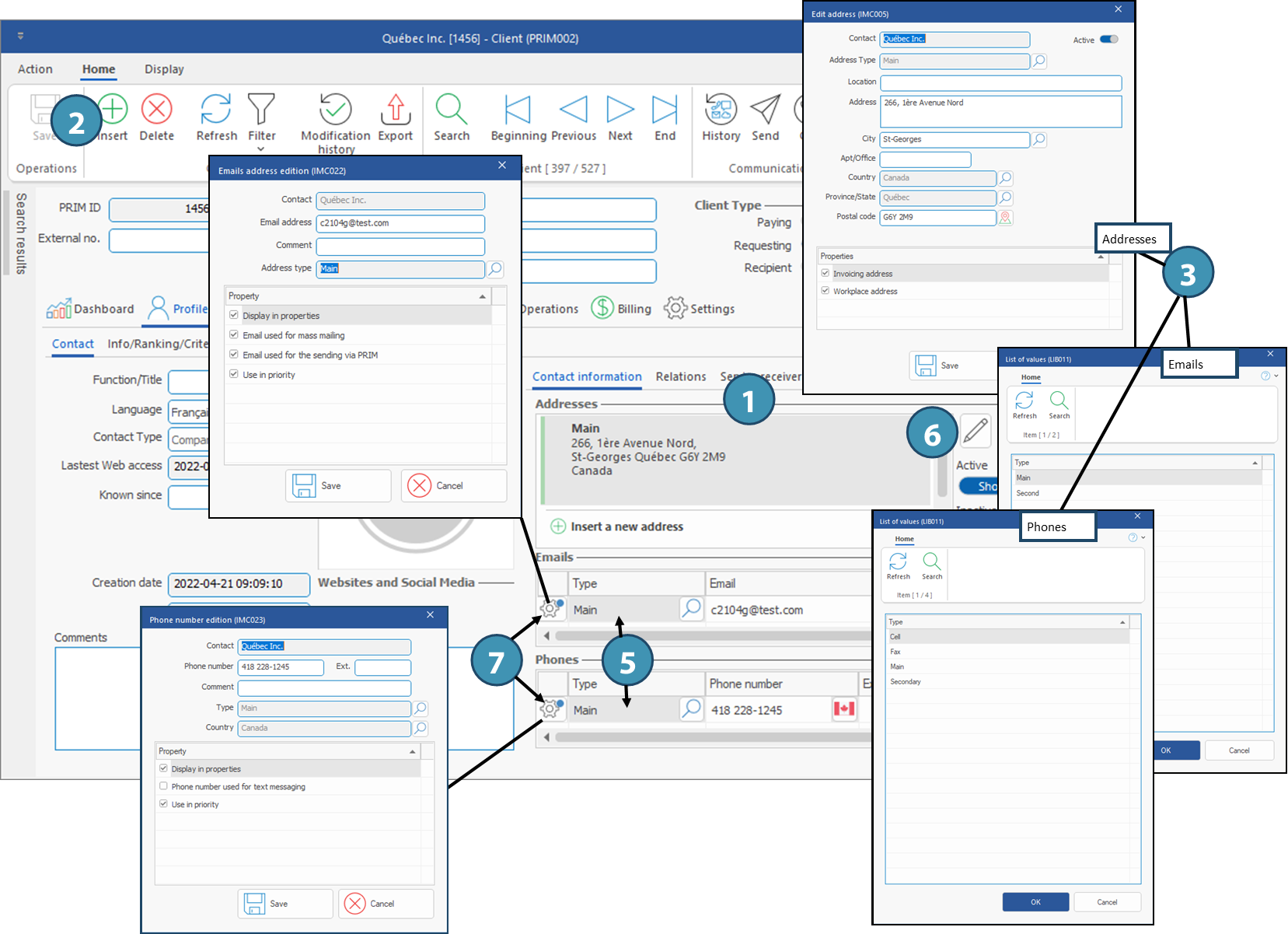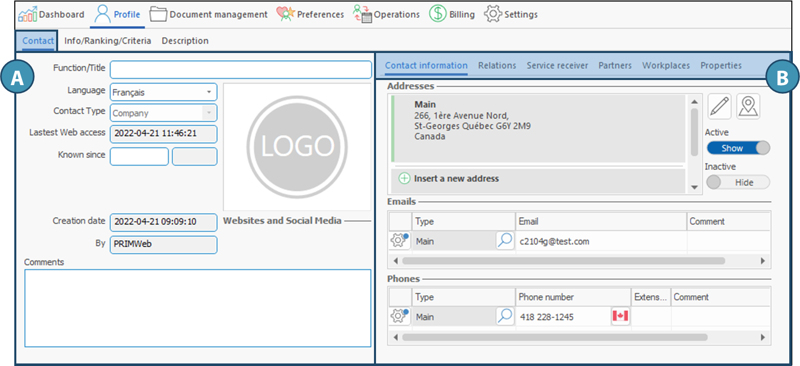 This sub-tab allows you to add the main contact information for the client : street address (A), email addresses (B), phone numbers (C).