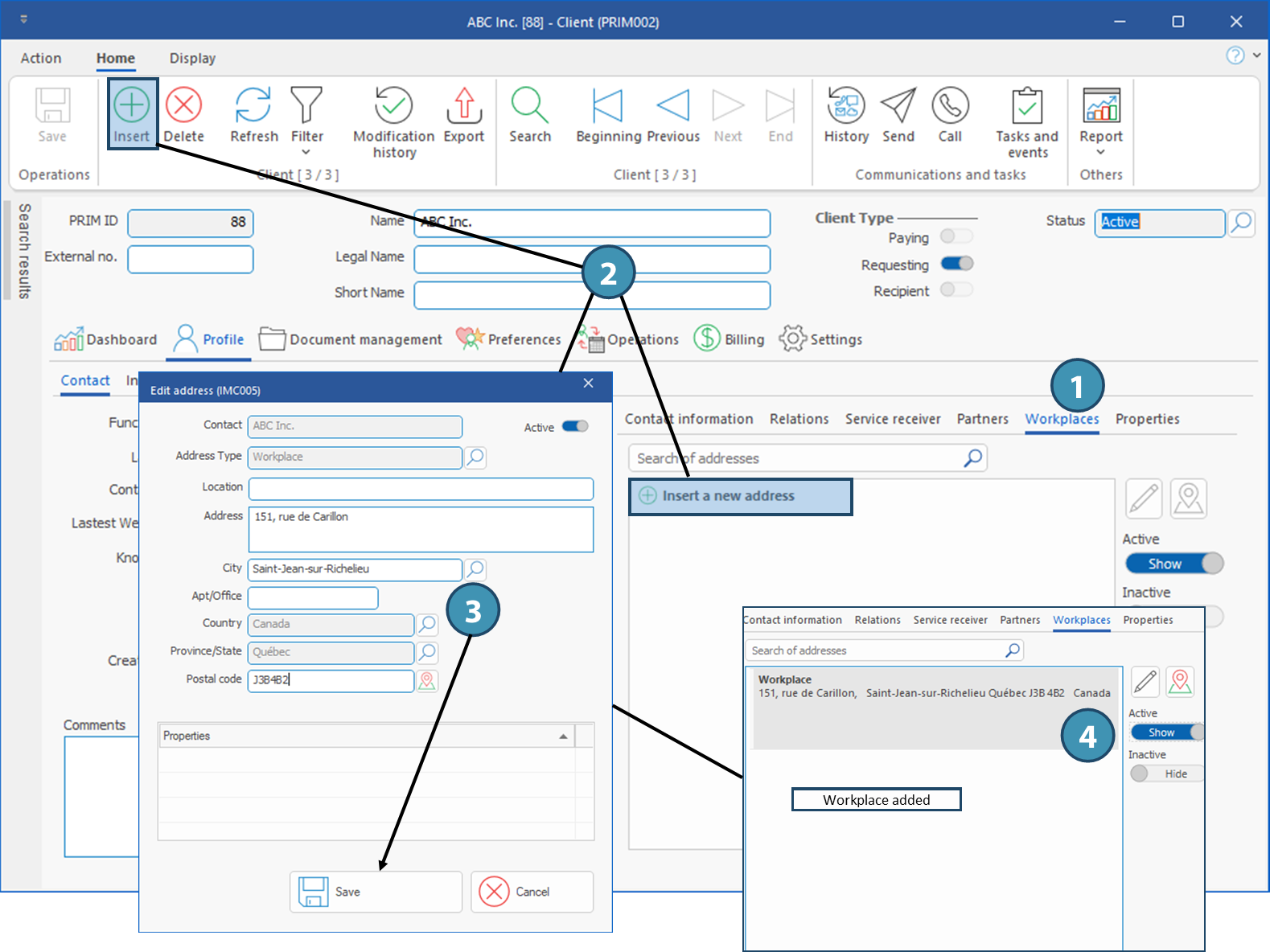 By default, the main address or a secondary address added in Contact information tab can be defind as the workplace for a client: however, only one address can have this property in this tab. If a client has several workplaces, it is possible tot set up additional workplace addresses in this tab.
