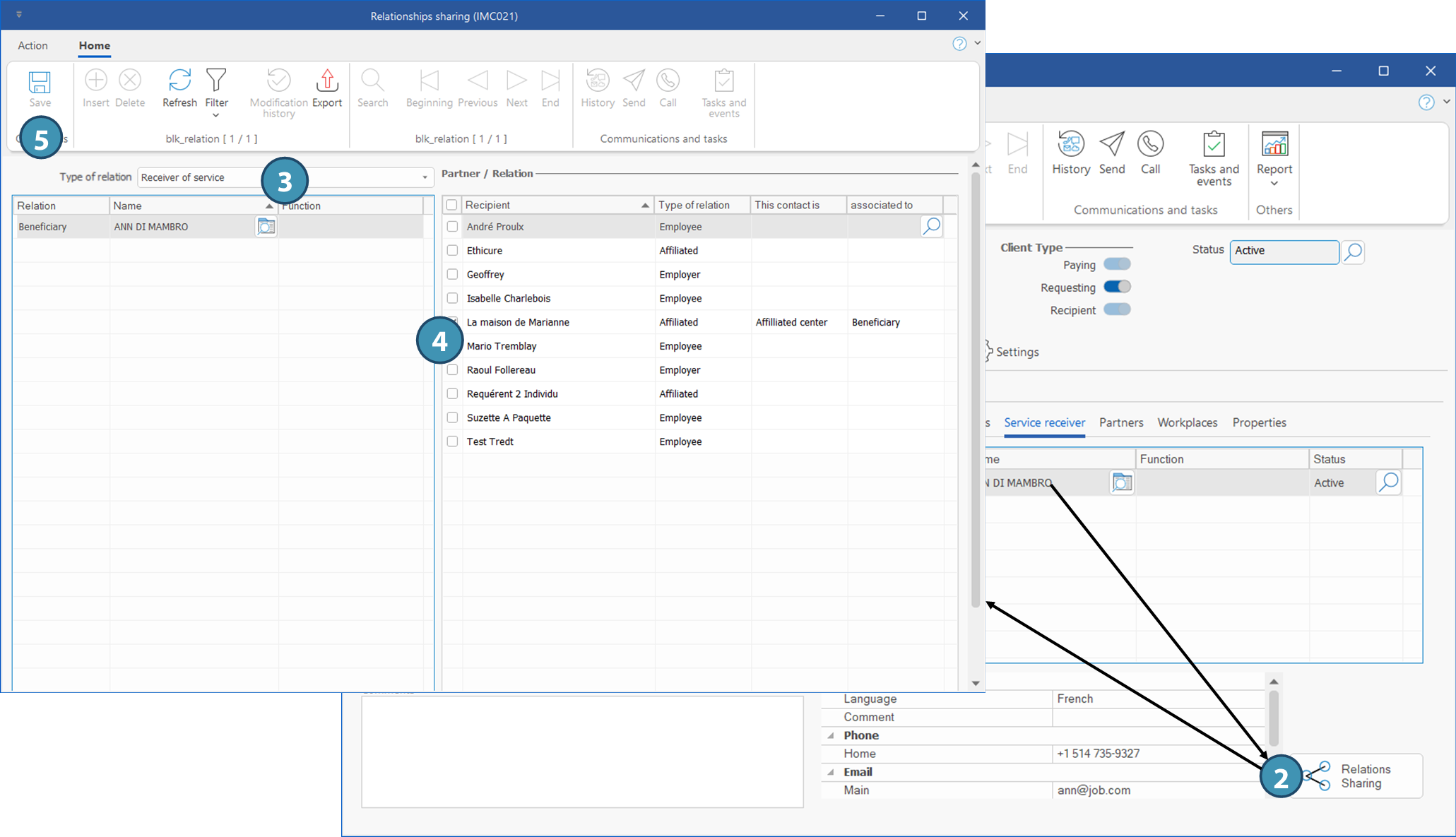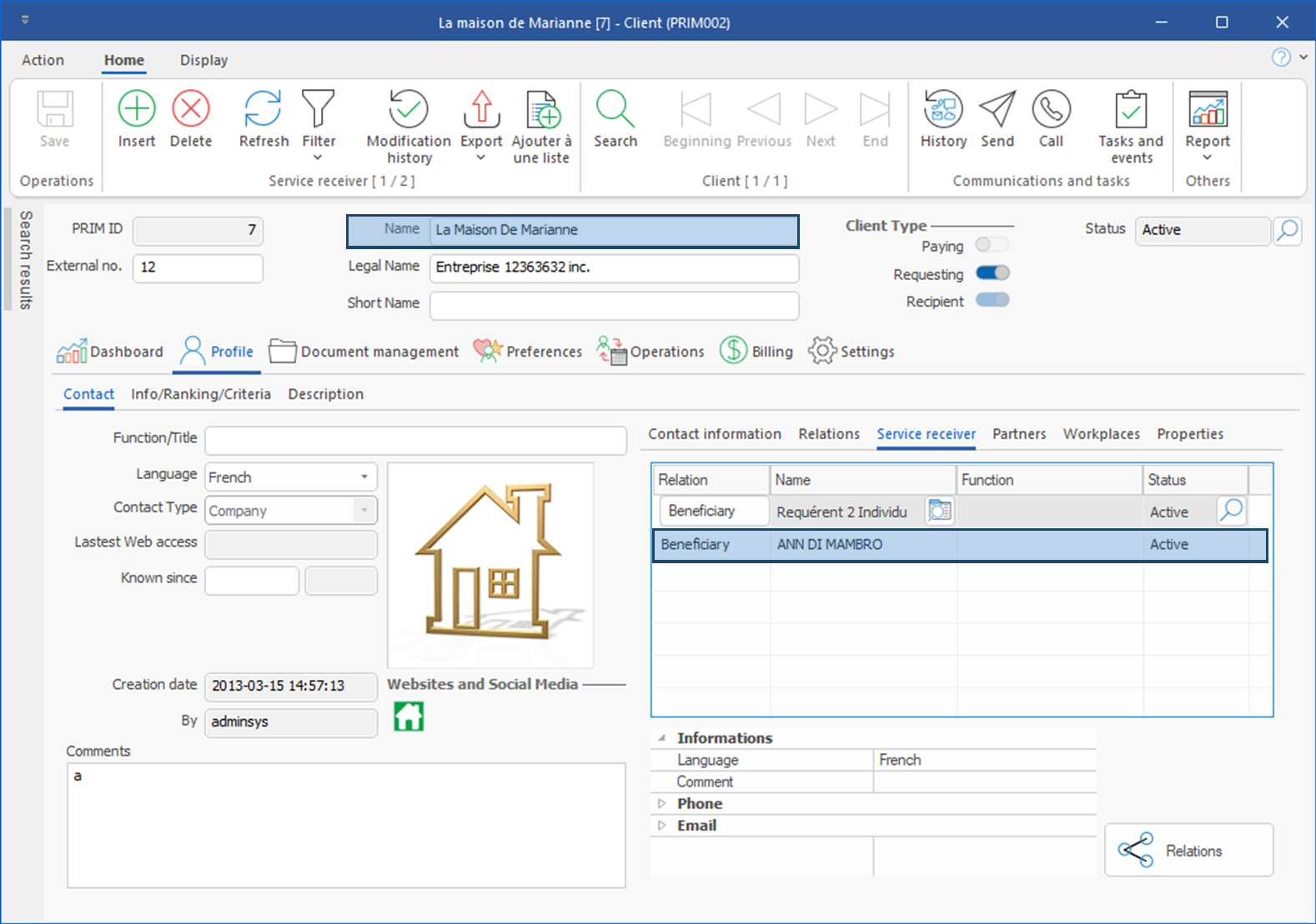 6.Now let's open the client file "La maison de Marianne" to check that the client now has the relation "ANN DI MAMBRO" as a service receiver. 7.