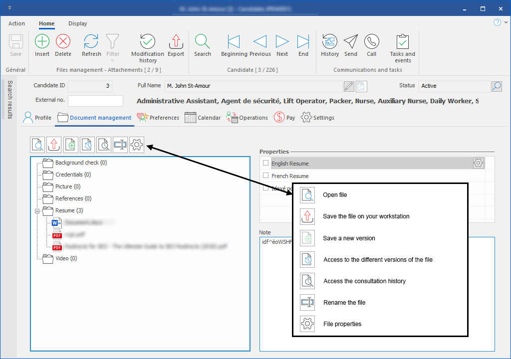 The "Document Management” tab is found in several windows of PRIM Logix, such as "Client", "Candidate", "Employee" and "Division" as well as in the "Contacts management" window and contains all the relevant documents of the folder.