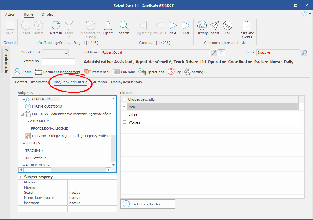 The "Info/Ranking/Criteria” tab is found in several windows of PRIM, such as Client, Candidate, Employee, Shift and Division. The options and the choices of this section will be different depending on the folder and will have an impact for the search of correspondence of a candidate for a shift or a position.