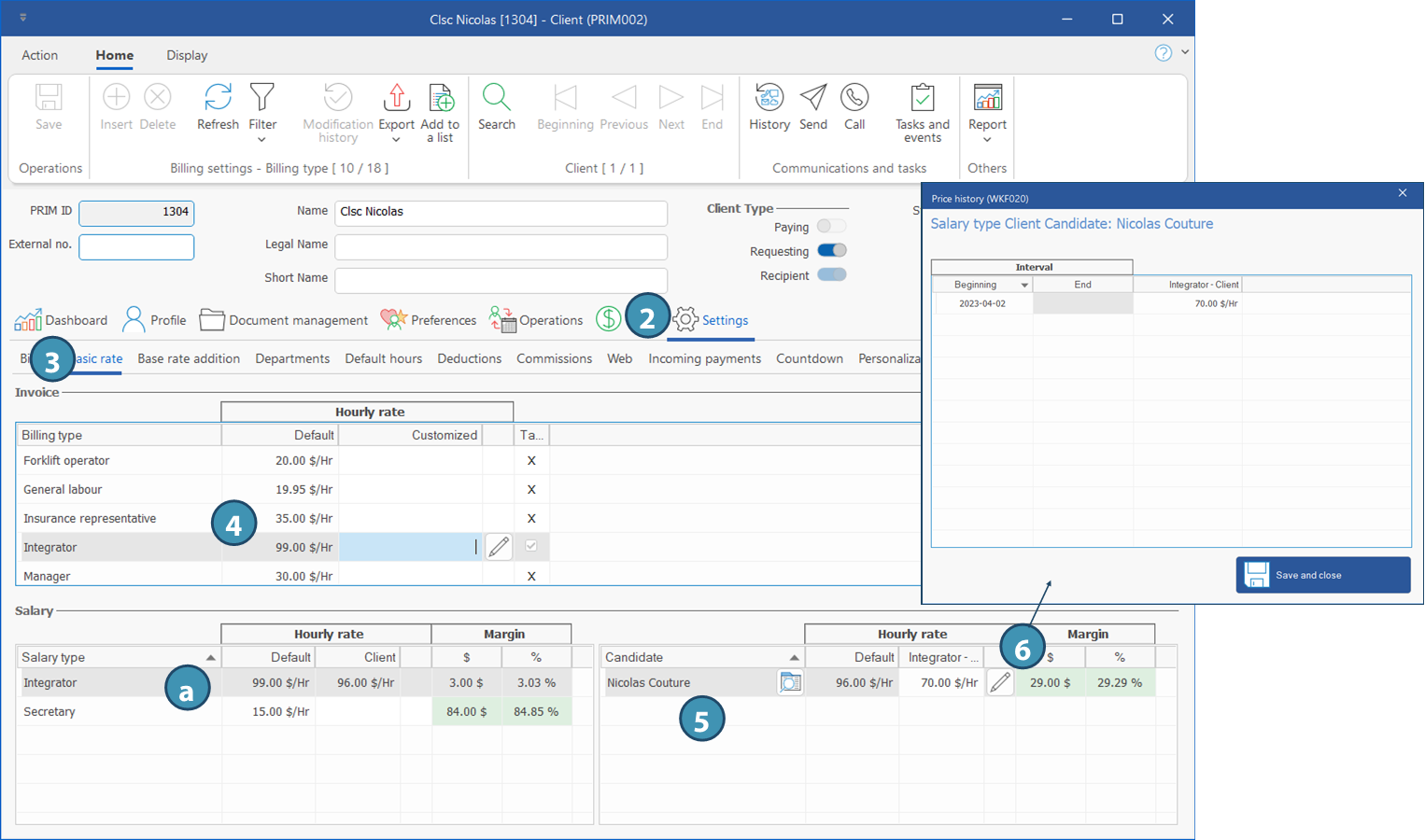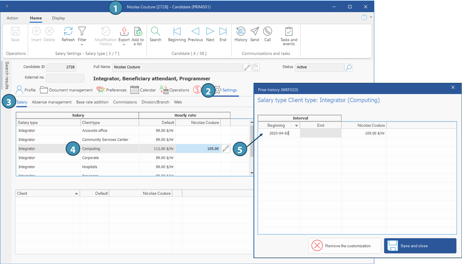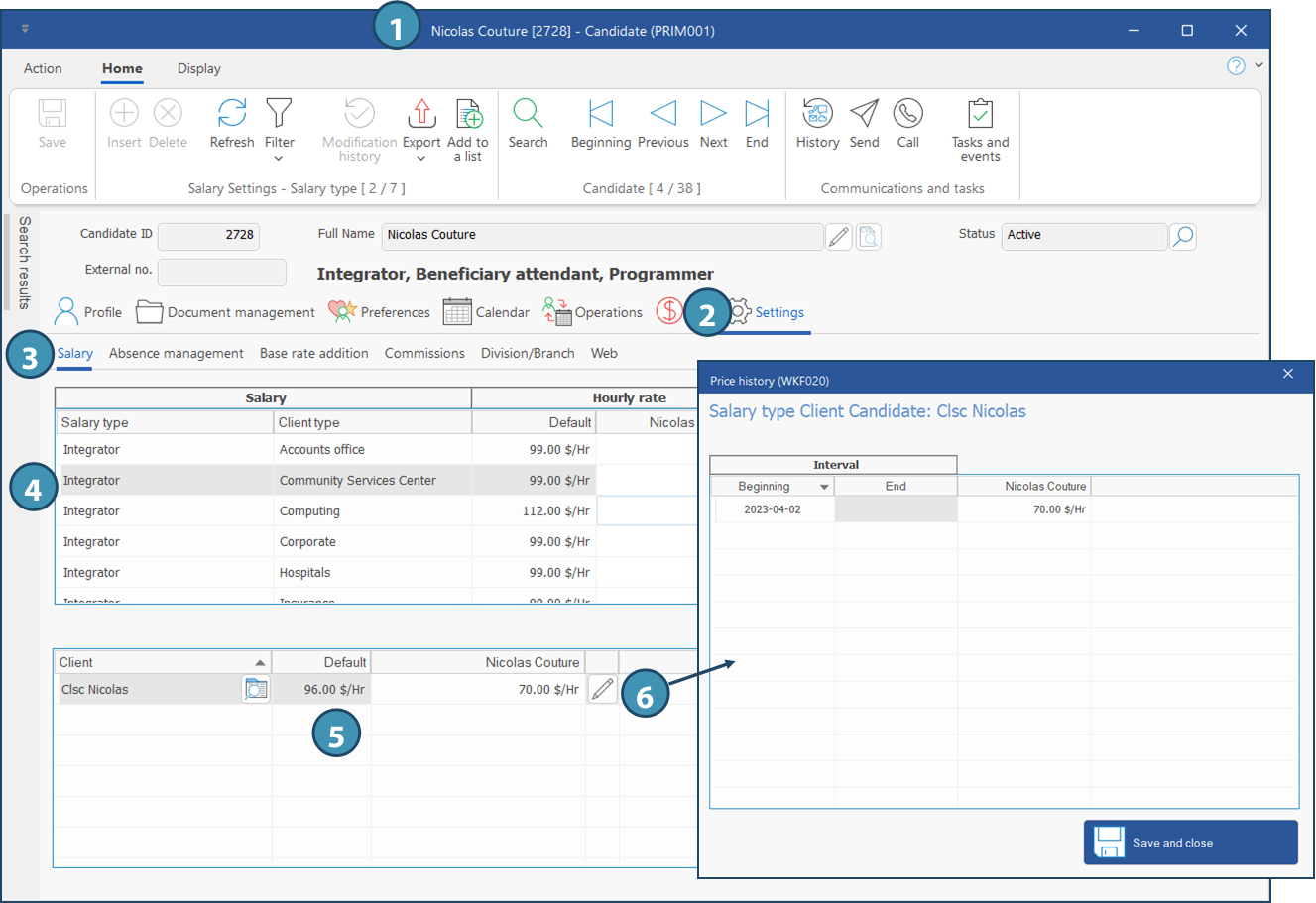 6.Click on (Edit) to open the Price history window. Enter the effective date, the candidate's salary and click on Save and close.