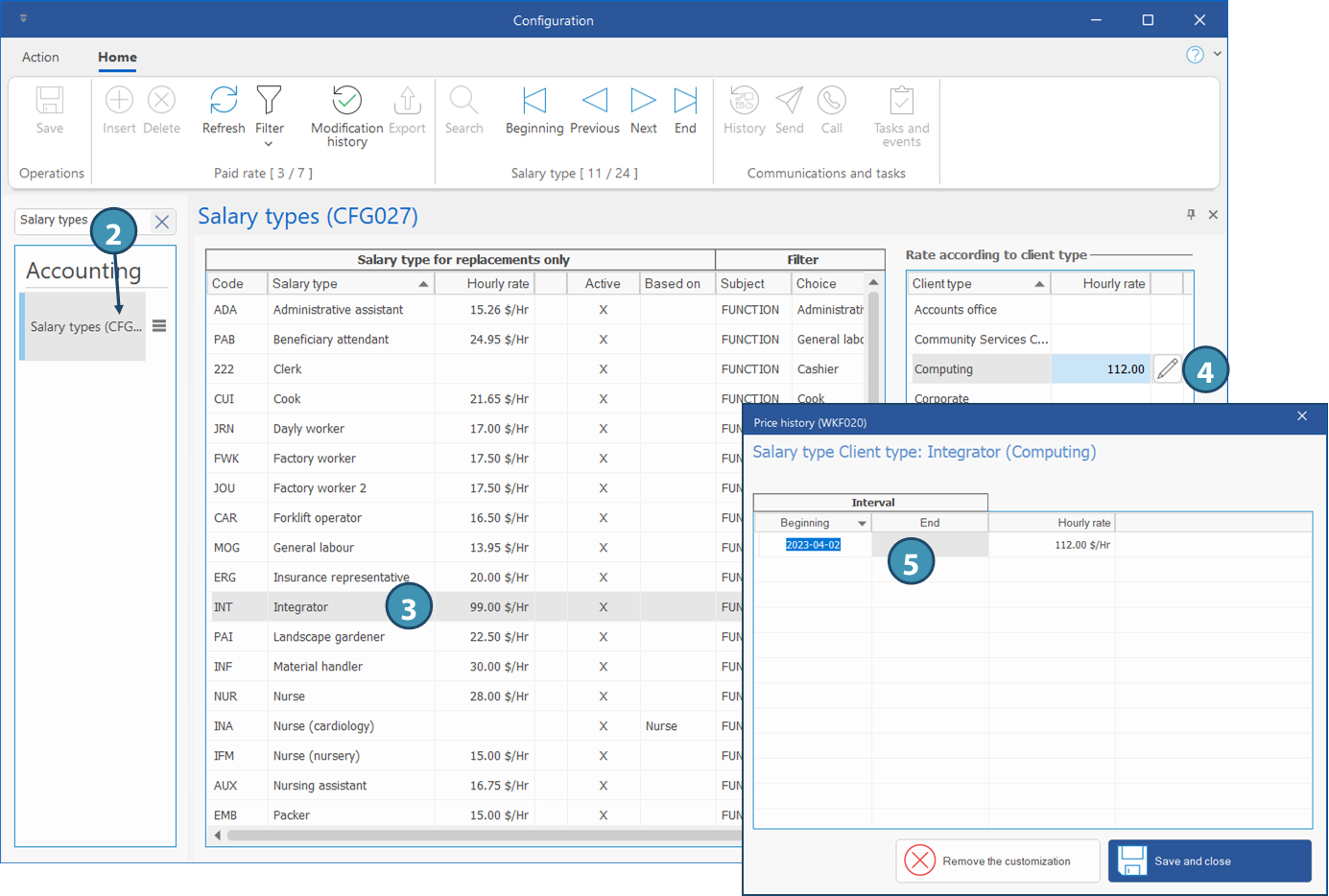 a.In this case, the billing type has the same designation as the salary type. However, this might not always be the case depending on your customized configuration. Furthermore, a billing type may be linked to several salary type.