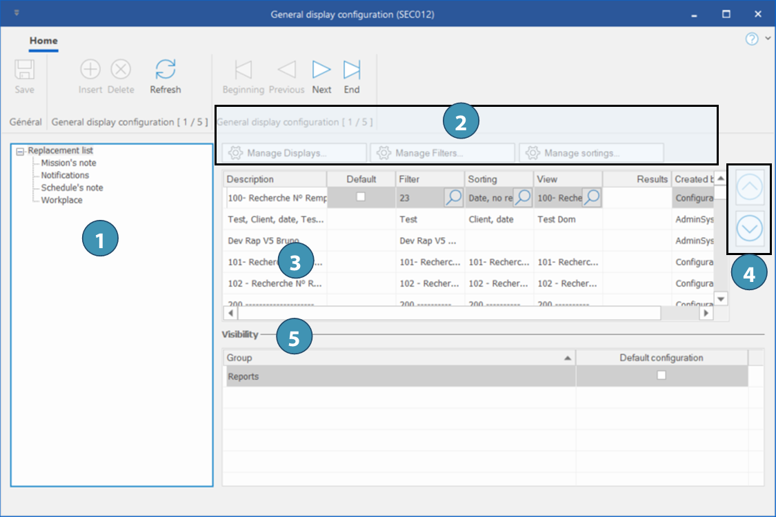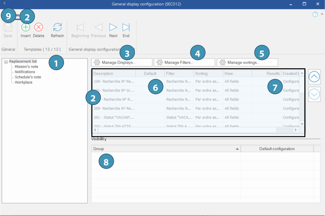 3.List of existing saved displays. The "Default" column allow to define the active default display at the opening of the window.