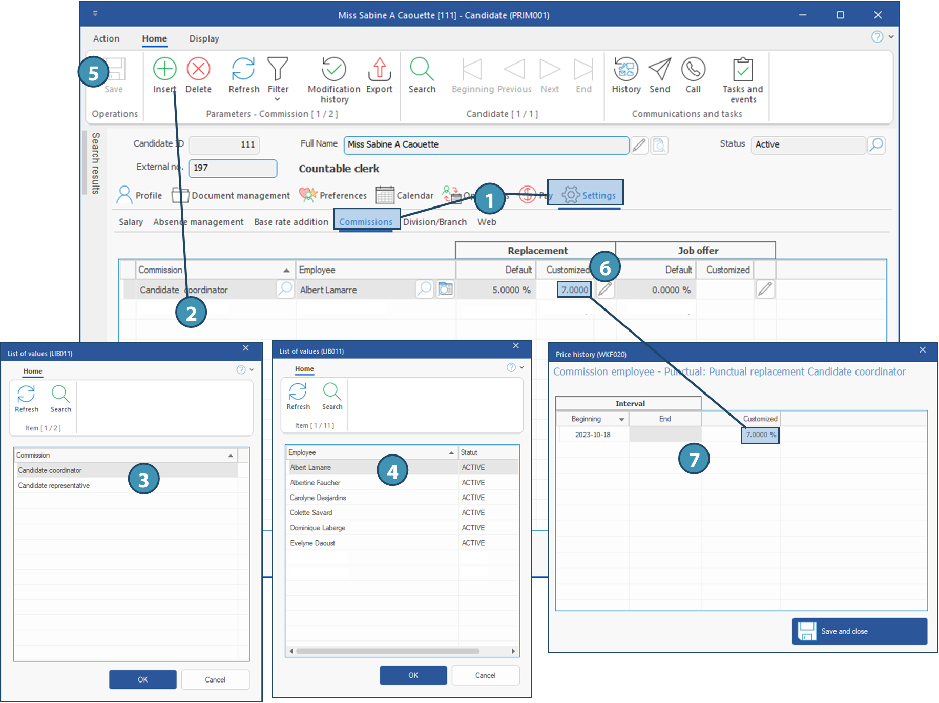 1.From a candidate file, click on Settings tab and on Commissions sub-tab.