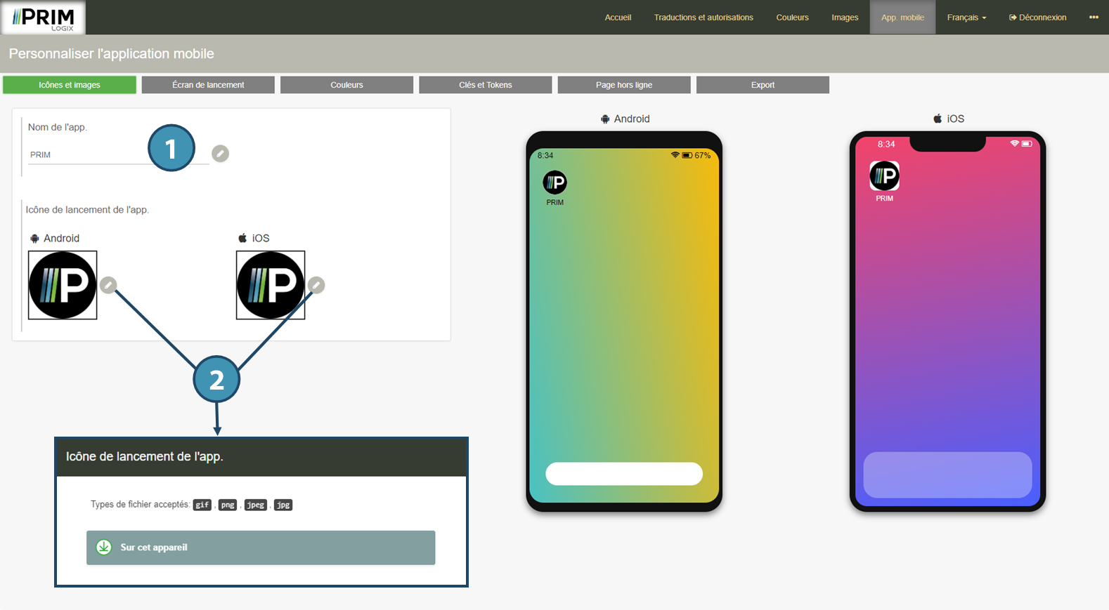 This mobile application customization tab lets you change the application name(1) and launch icon(2). Customization is possible for each version of the application.