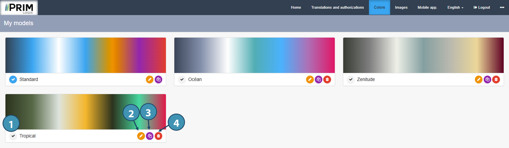 The colors customization page displays various colors templates included in the basic configuration of PRIM Logix Web portal. .