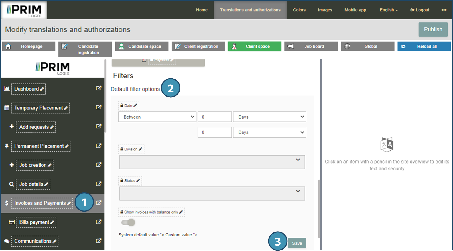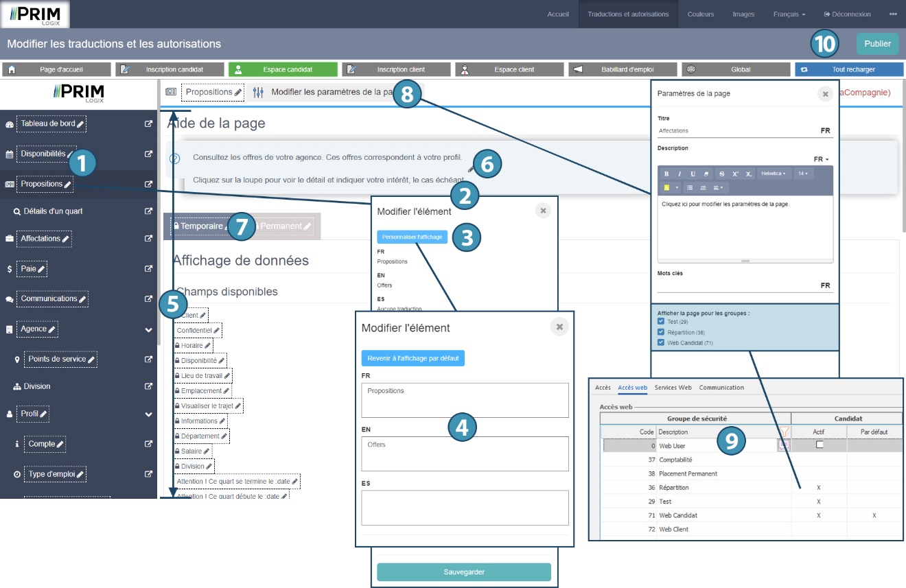 The "Translations and authorizations" menu allows you to modify all the labels visible on the Web portal, except those that come directly from the PRIM Logix software (for example: the title of a shift or a list of criteria).