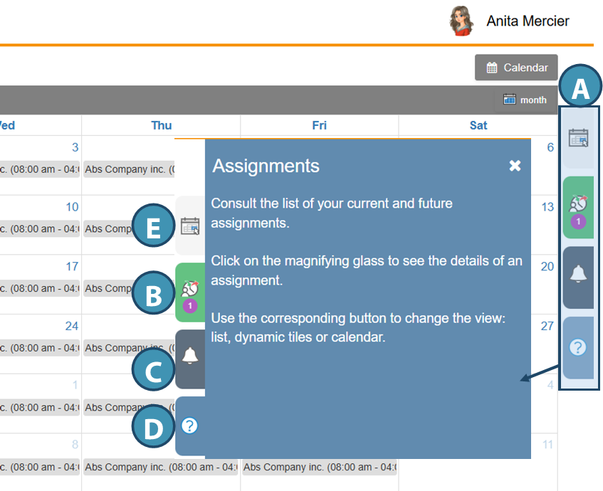 -E: Present in the " Availabilities " and " Assignments " sections, this tab lets you manage availabilities entered on the selected date or view the details of selected assignment in calendar view of the Assignments page.