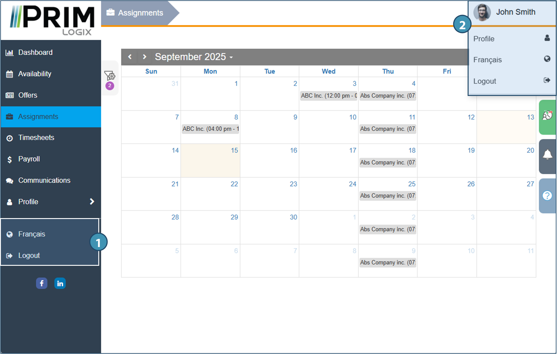 By clicking on the left-hand menu(1) or on the user's name in the top right-hand corner(2), the user can change the display language and log out of the web platform.