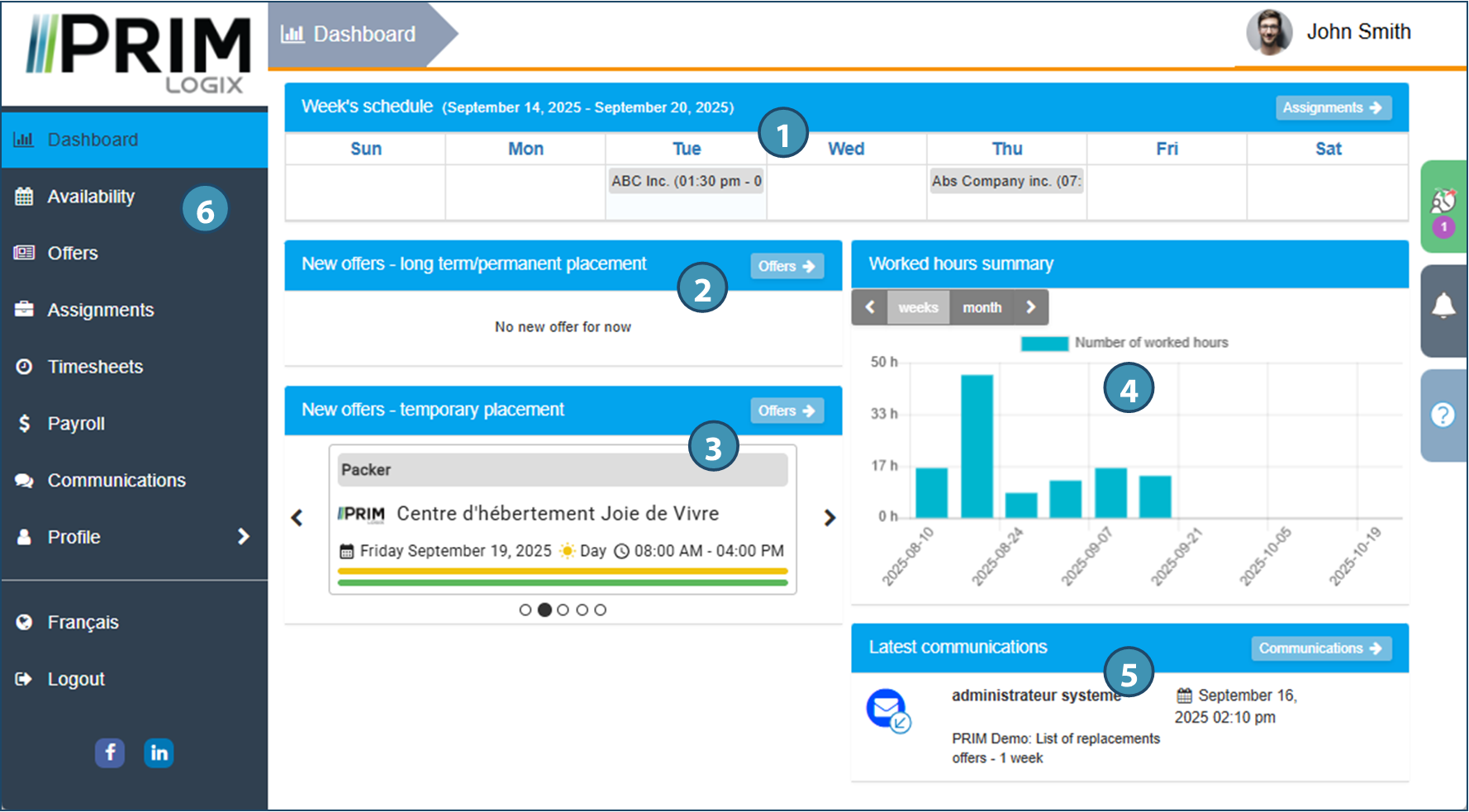 The home page of the candidate area is a dashboard that shows a summary of relevant information, presented in tile form. Users can consult their schedule for the week(1), upcoming temporary(2) or permanent(3) job offers matching his/her profile, a summary of the last hours worked(4) and the last communications exchanged with the agency(5). Finally, the user can access the news feed of the agency's social network, if it has been set up to do so.