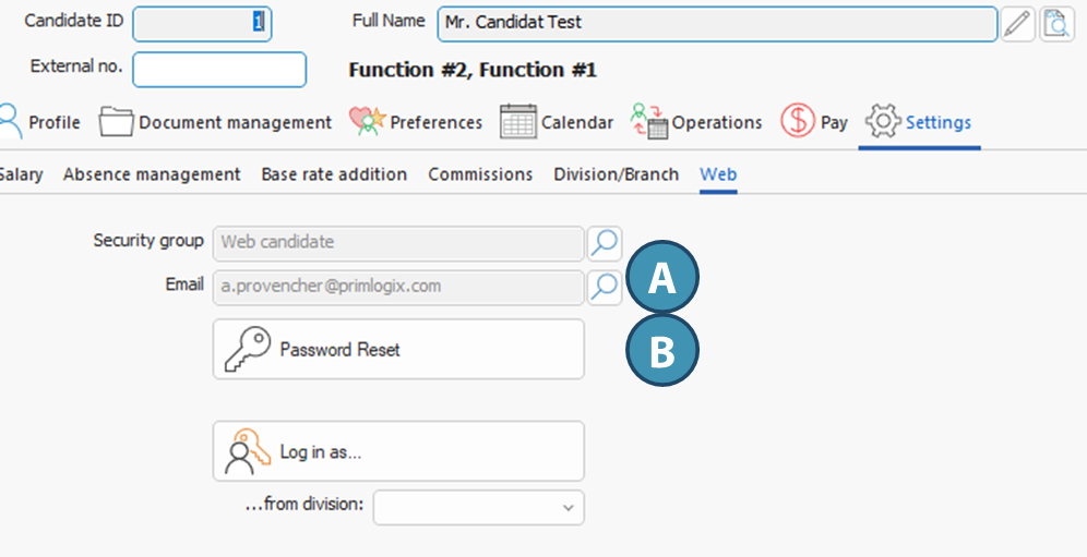 On the right-hand section of each page, tabs also open contextual menus(A). Their presence depends on the page the user is on: