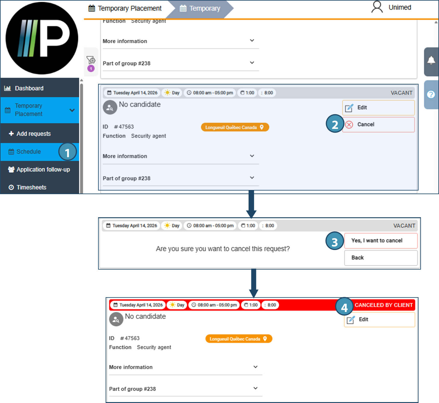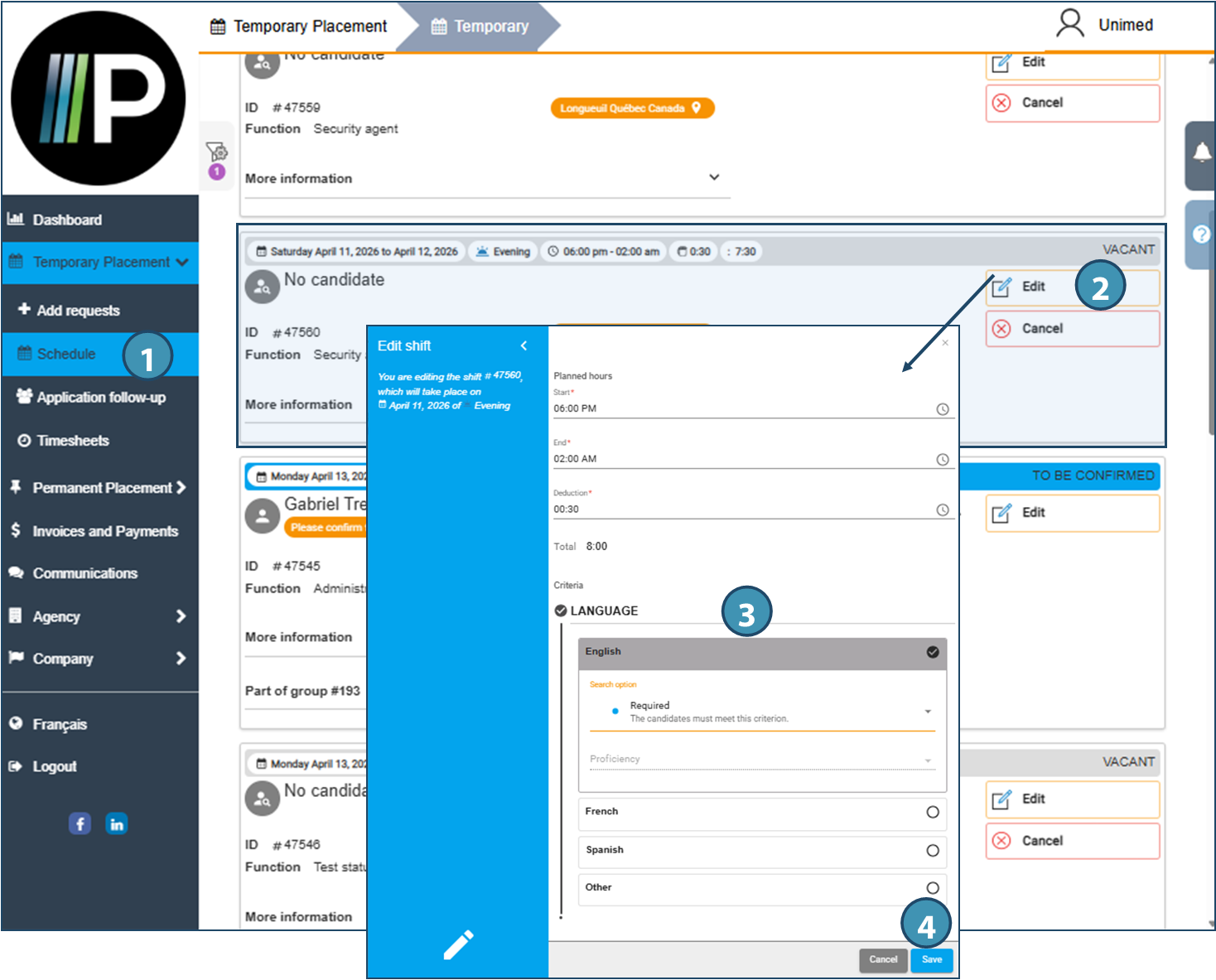 Depending on the agency's configuration, a client can create requests from his web portal and transmit them to the agency. It will also be possible to confirm a request, or cancel a vacant shift. Depending on the case, the requests created can also be modified as required.