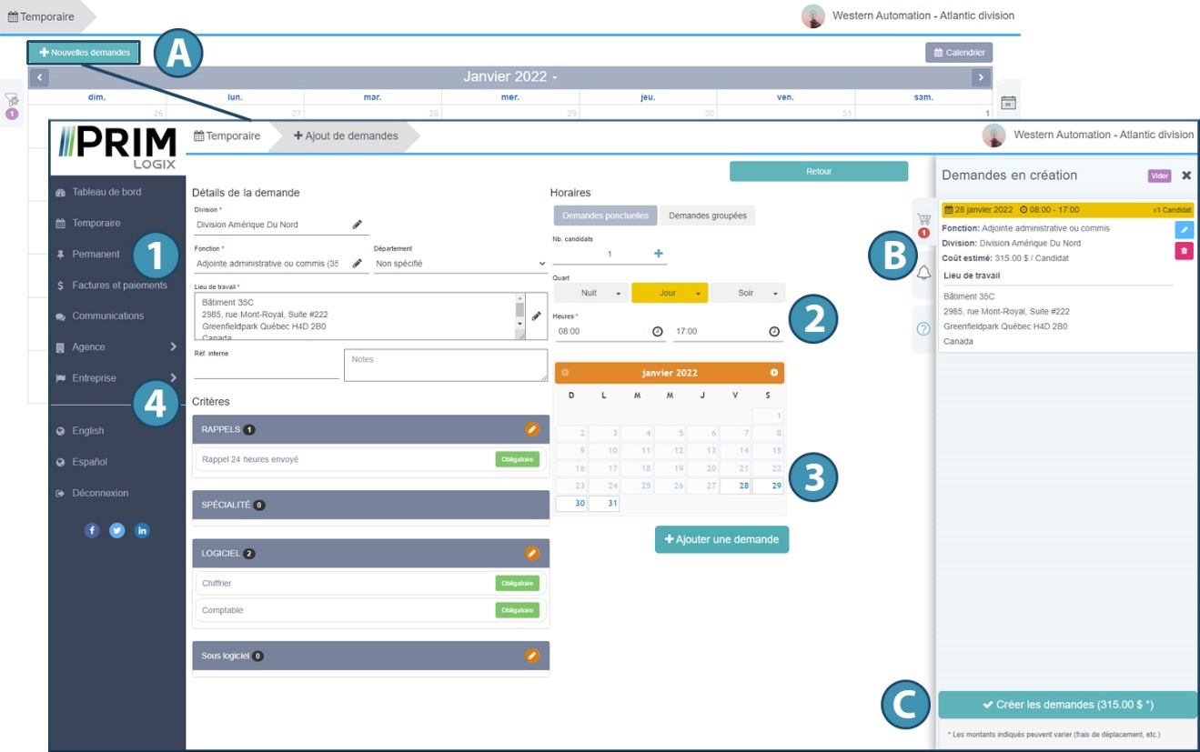 By clicking on the add request button (A), the user can create a new request by filling in the required fields, in particular :