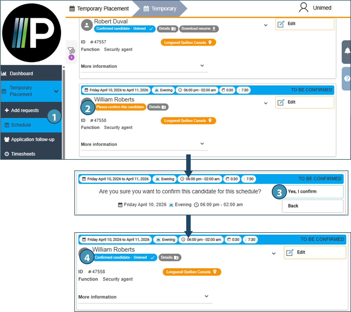 1.Go to the Schedule page. 2.Locate the shift to be confirmed, and in the tile, click on Please confirm this candidate.