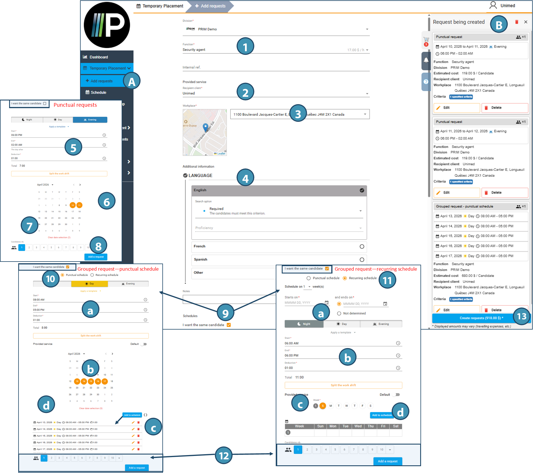 For grouped requests: 9.Check the I want the same candidate box, then indicate whether this is a one-off schedule (selected dates) or a recurring schedule (selected days, schedule repeating from week to week). 10.In the case of a one-off schedule, tick the corresponding box, indicate the type of shift and hours(a), specify one or more dates(b), then click on Add to schedule(c). Shifts are added to the Shifts section of the schedule(d). You can then add other shifts with different times, if required. 11.In the case of a recurring schedule, check the corresponding box, indicate a start and end date(a), the type of shift and hours(b), select one or more days of the week(c), then click on Add to schedule(d). The week is added at the bottom. If this recurring schedule is a multi-week rotating schedule, it is possible to add the other weeks in the cycle. 12.Whether the type is a one-off or a recurring schedule, enter the number of candidates required for this schedule and click on Add request.