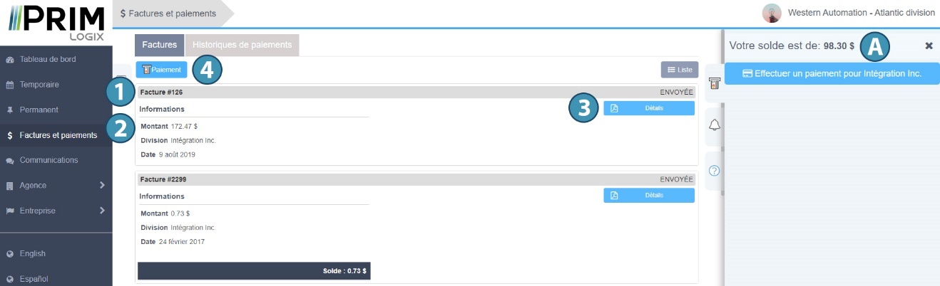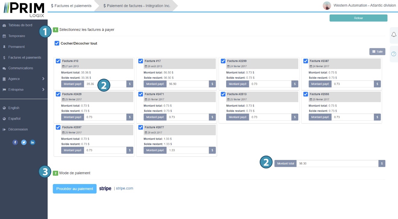 The user must then select the division to which the payment is to be made, if applicable. Next, a form prompts you to select the invoice(s) for which you wish to make a payment(1), and the amount of the payment(2). Finally, the user is invited to select a payment method(3).
