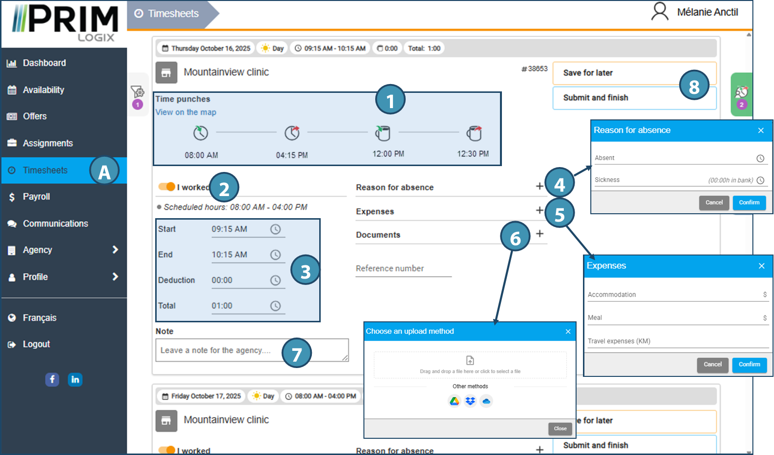 Timesheets are available in the Timesheets page (A), and usually from the day of the shift concerned, unless the agency has set different settings to allow advance completion, if applicable. Alternatively, if the agency allows, it is also possible to access it from the assignment page, using the View timesheet button on the relevant assignment tile.