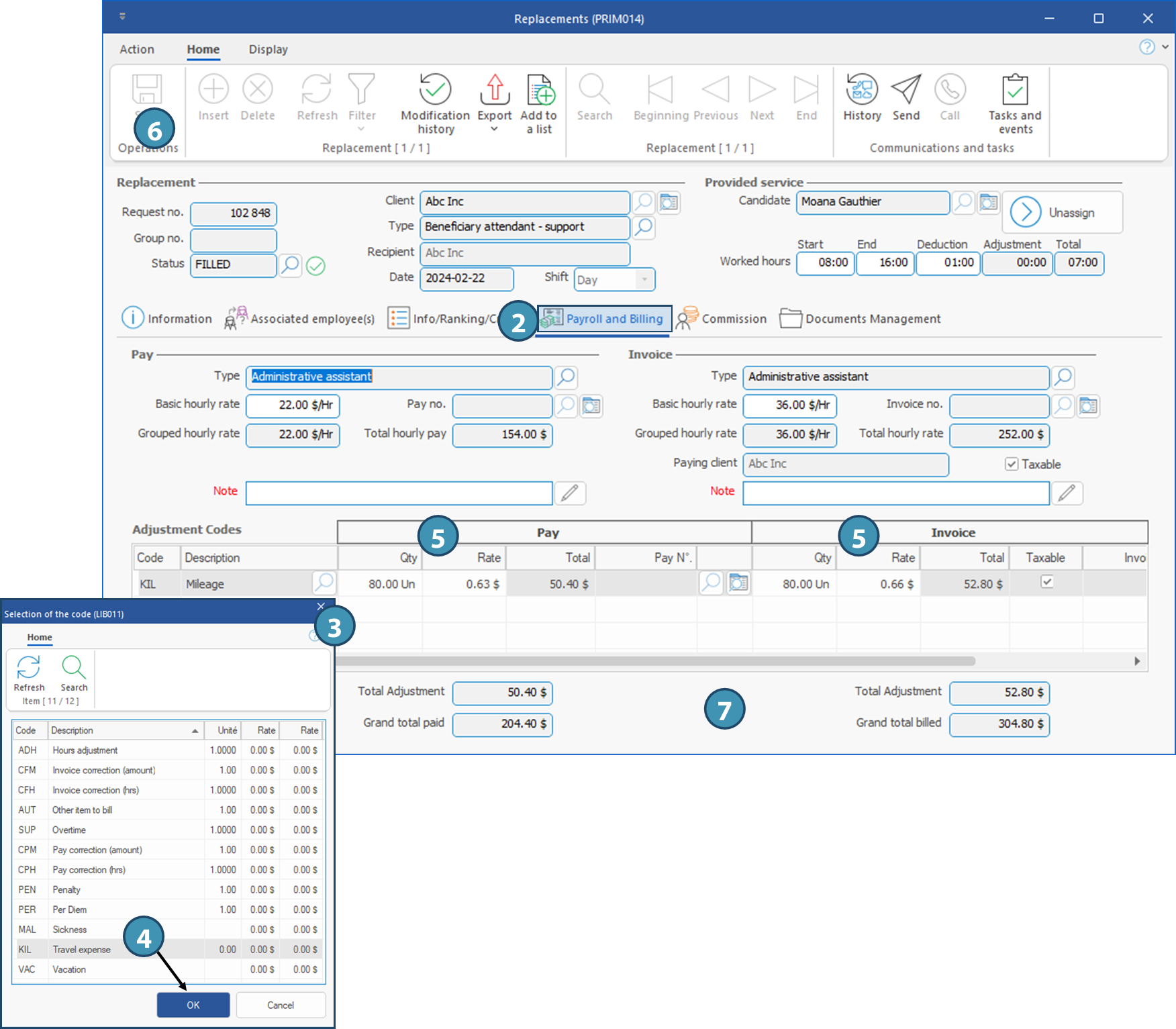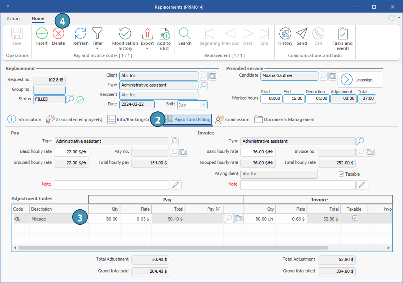 1.Open the request on which you want to make changes. 2.Click on the Payroll and billing tab. 3.In the Provided service section, select the fields to be modified ( le ou les champs (Début, Fin ou Déduction) à modifier et inscrivez les nouvelles valeurs. 4.In the Pay section, select the amount in the field Basic hourly rate and enter the new amount. 5.Repeat the procedure for the Invoice section, if applicable. 6.Move to the bottom section for codes and select the line of the code you want to modify. 7.In the Rate column, select the amount in the field and enter the new amount. 8.repeat the procedure for the Invoice section, if applicable. 9.In the Home ribbon, click on