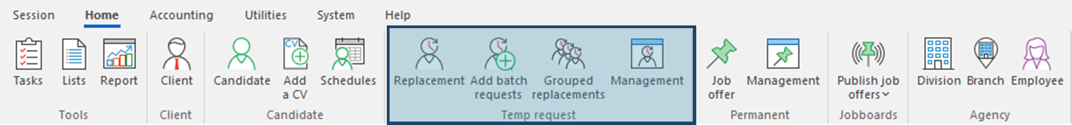 Information and operations pertaining to temporary requests will be found in the section Temp request of the Home ribbon.