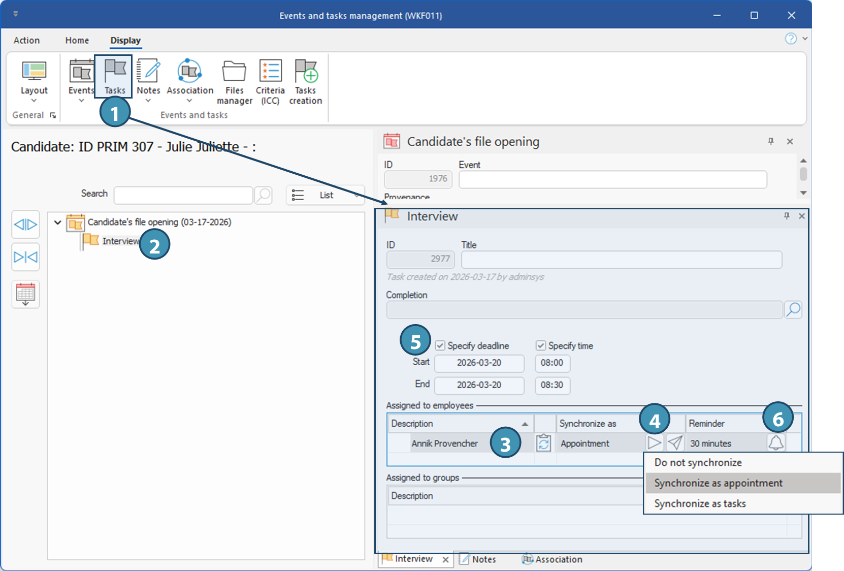 Here we illustrate the procedure from a candidate's file, in the events and tasks management window (WKF011), in list mode: