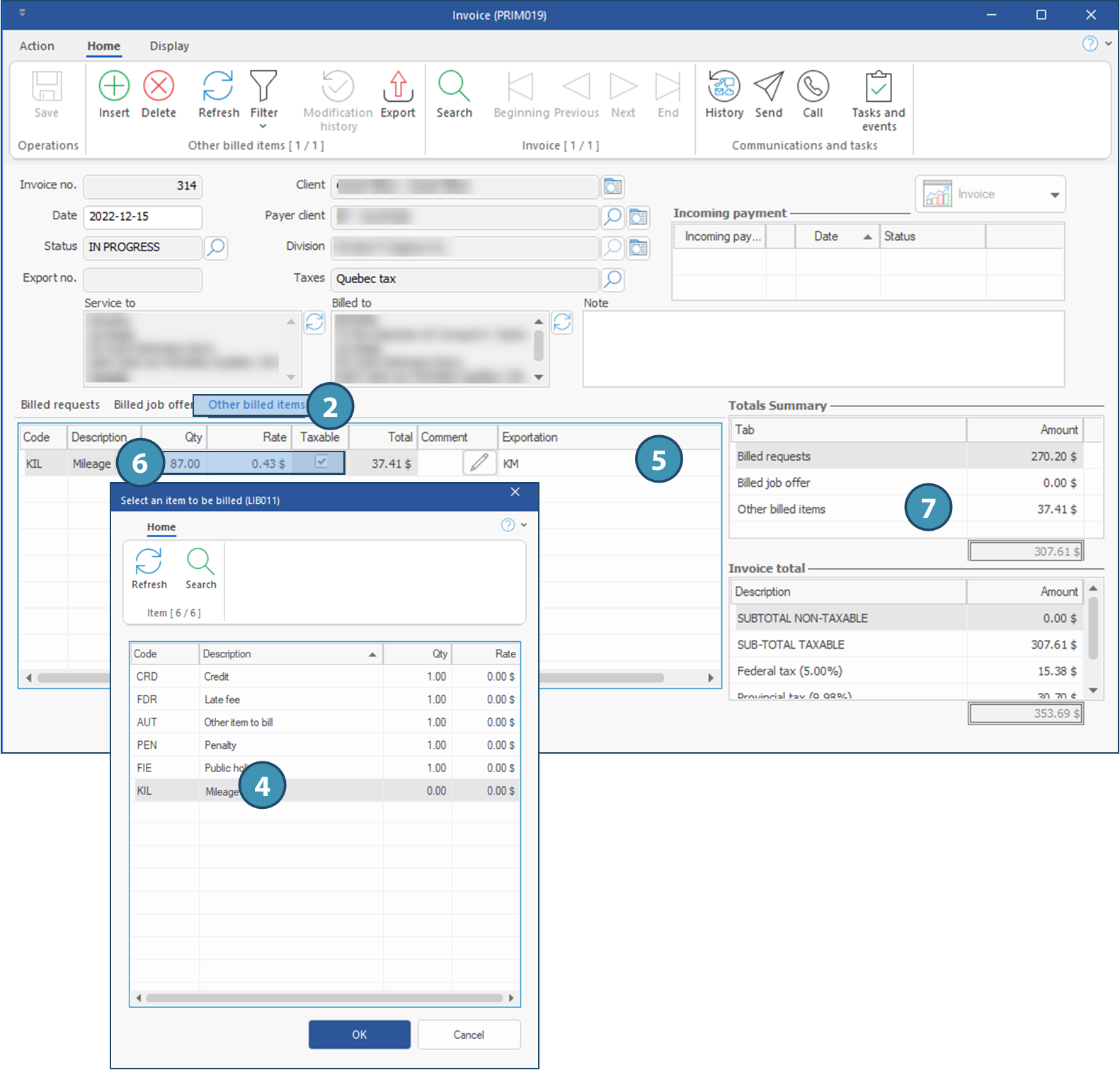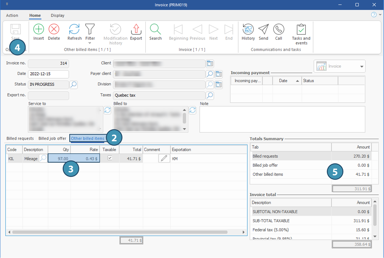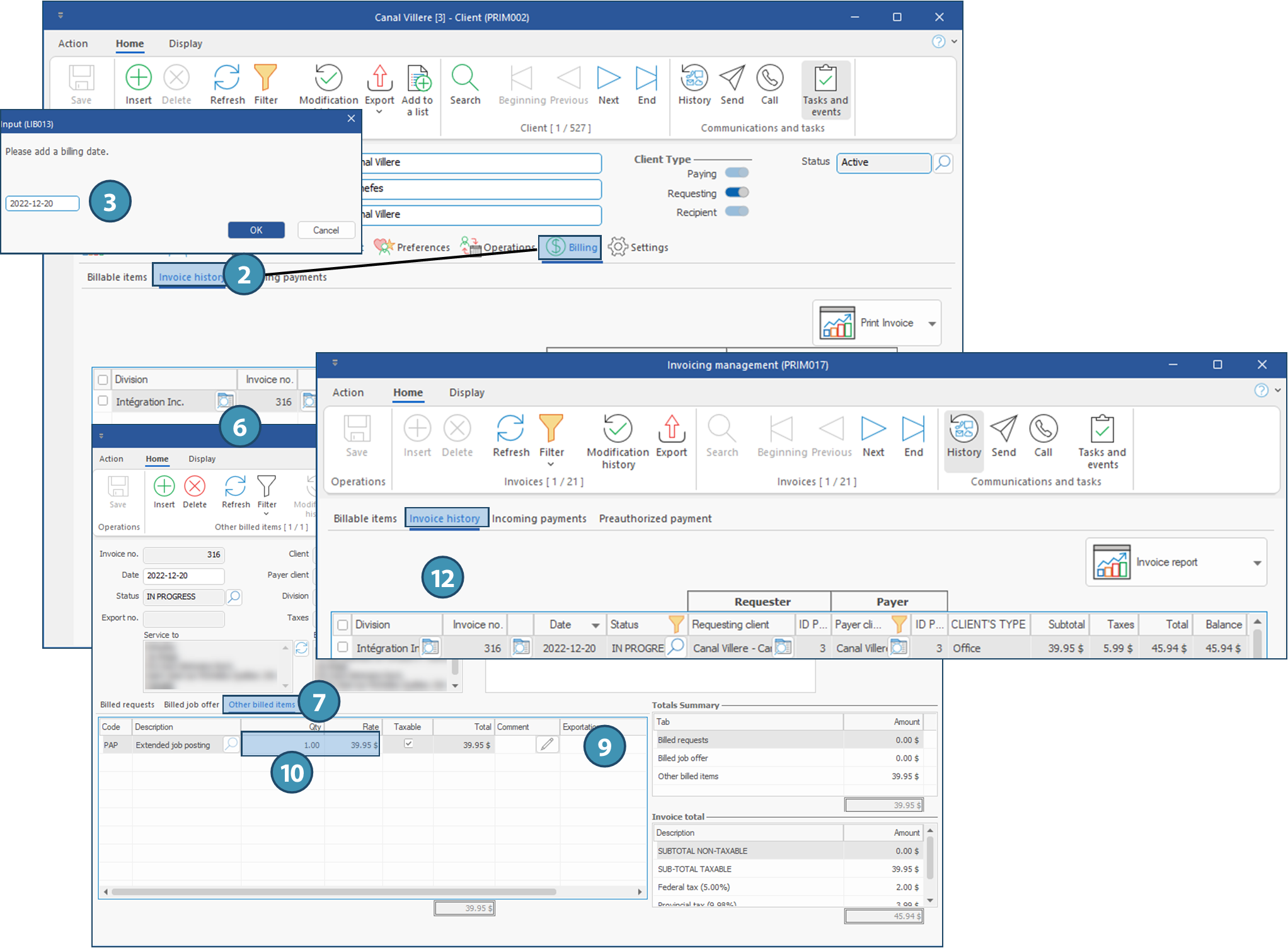 3.Click on a blank line of the main area or on 4.Fill in the requested information (Division) in the selection window. 5.The invoice is added to the list, with status In progress. 6.Click on 7.Move to the tab Other billed items. 8.Click on a blank line of the main area or on 9.If applicable, select an export code. 10. If needed, change the quantity, the rate or uncheck the box "Taxable". 11. Click on 12. The invoice will also be found under the Invoice history tab of the "Invoicing management" window, with the status In progress.