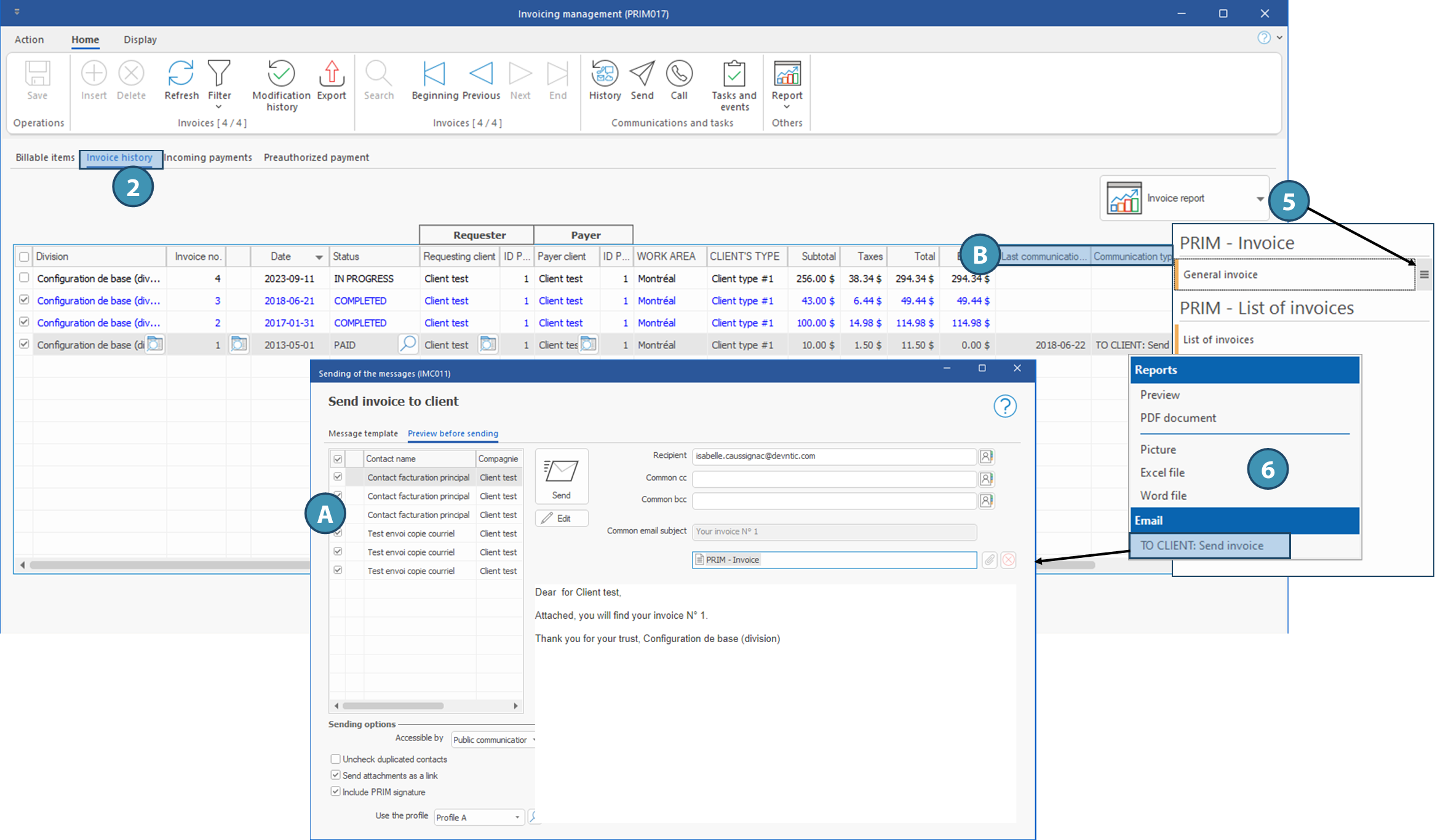 Step 1 - verify invoices in progress 1.Open a "Invoicing management" window. 2.Move under Invoice history tab to check the invoices with status In progress, and make sure not to add new items to an existing invoice if you want PRIM to create a new invoice for your client. 3.In this list, apply a filter in order to display only the invoices with status In progress. 4.If needed, select the invoices to complete and change the status for Completed to avoid additions to these invoices. (See step 3).