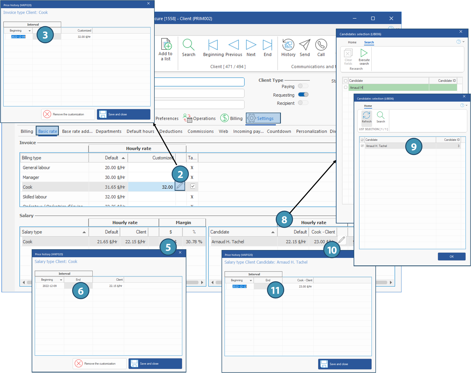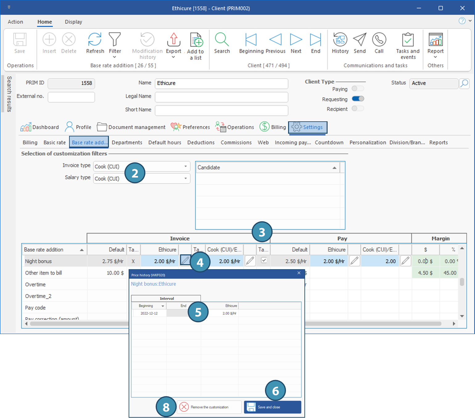 1.In a client file, click on Settings tab and on Base rate addition sub-tab. 2.Under Selection of customization filters, select the Invoice type and Salary type to which you want to apply the customization. 3.The items related to the selected types will be displayed at the bottom of the window, in 2 main sections, Invoice and Pay. 4.Select an item in the list. In the column where you want to apply the modification, click on 5.Enter the start date on which the modification will be applied as well as the new amount. 6.Click on Save and close.